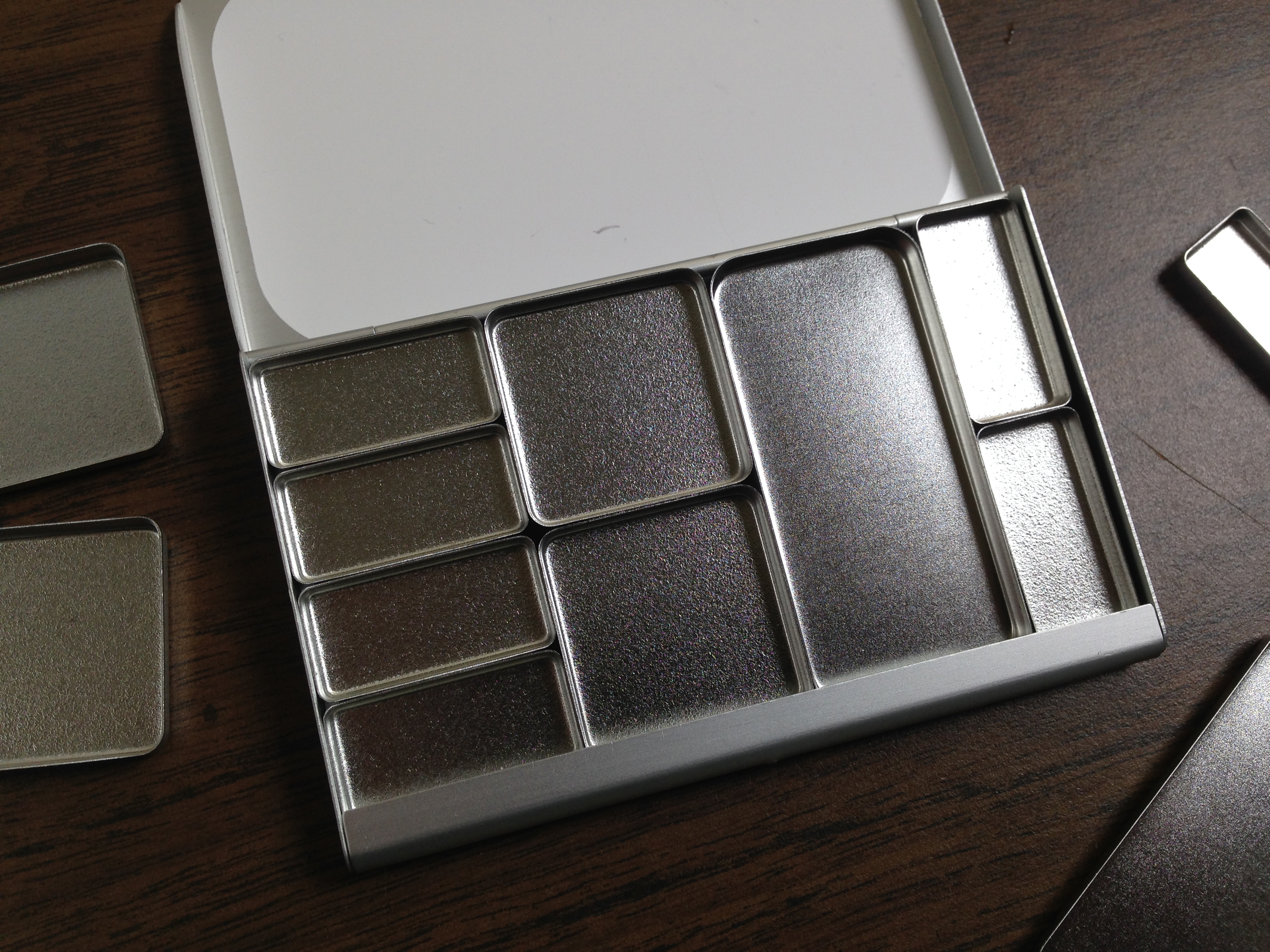 It’s a cute little gadget. Essentially a repurposed business card holder and three sizes of ultra-slim tin pans that you can re-arrange on the sheet magnet inside the case.