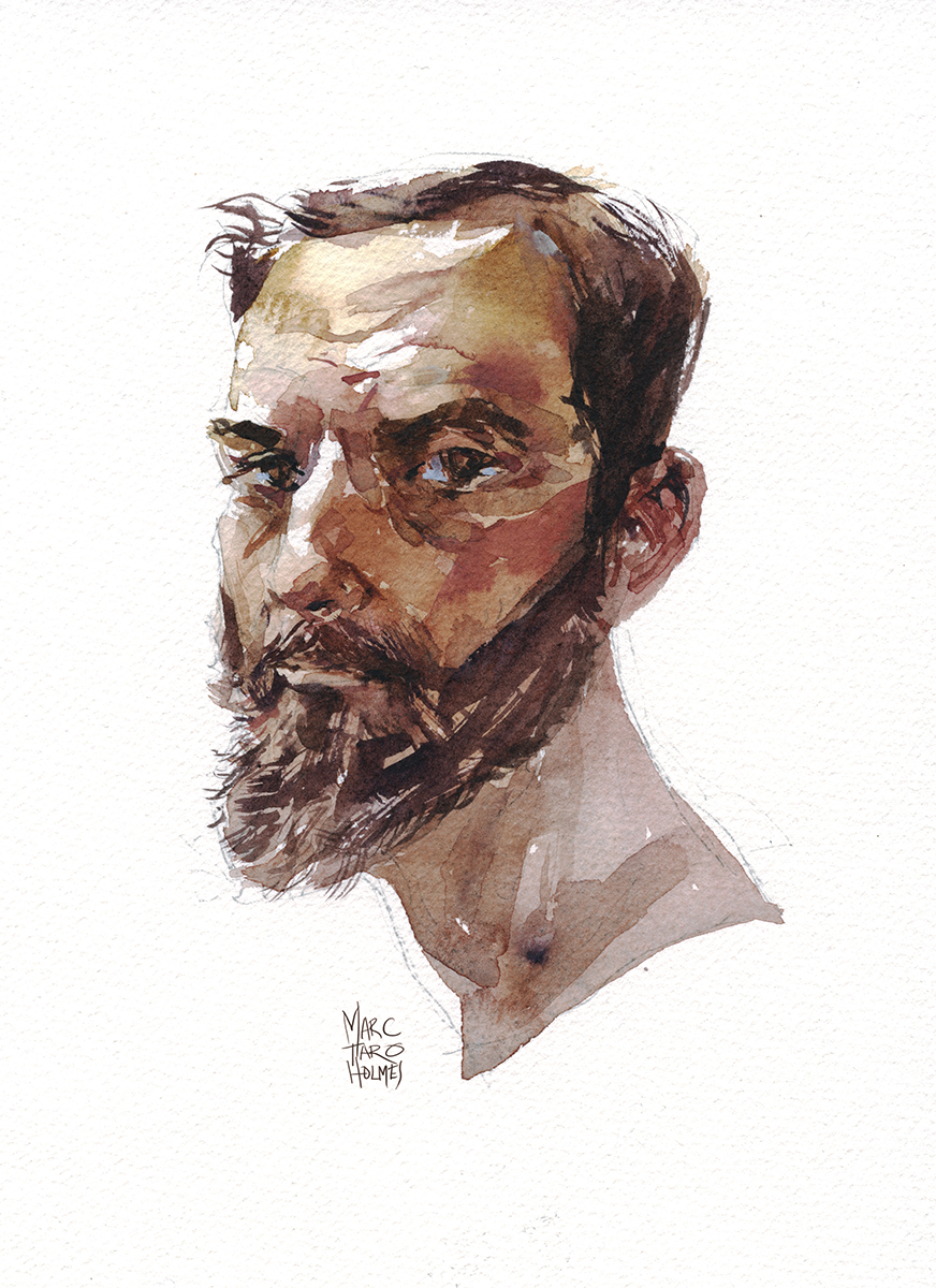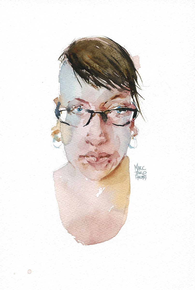 I’ve been testing out my on-air setup, doing a few small portraits (about 5×7″).  These start with a linear pencil sketch, and a big washy silhouette. I hit it with the hair dryer, and lay the small details on top. Larger-to-Smaller, Lighter-to-Darker! That’s all you need to know for watercolor :)