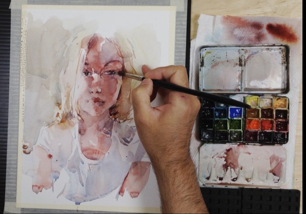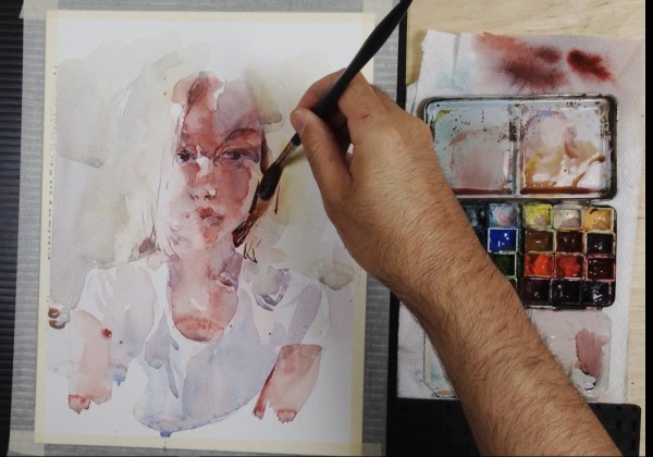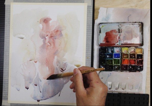 I’ve started the head with wet, diluted, washes of Perlyne Maroon, mixed with Buff Titanium, Naples Yellow, and a new blue I’m testing – Daniel Smith Verditer Blue (PB28, PB36, PW4).