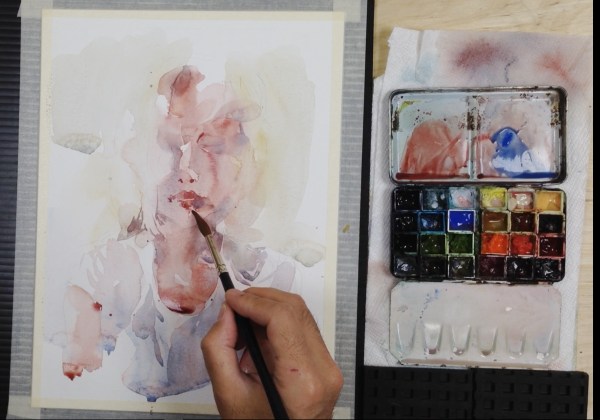 After allowing the first wash to dry, I can begin to lay Milky pigments over top of my transparent Tea.  Sometimes I’ll draw in a form like these lips – then lift or blend parts of it – to soften it into the under-painting.