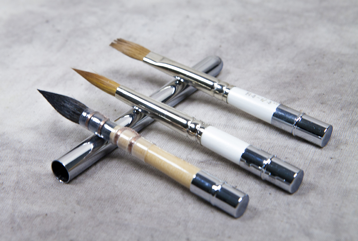 They’re a nice sharp sable brush, just a good as any I’ve tried. But – these are the reversible/pocket brush models, where the brush slips back into the hollow handle. So they’re extra convenient for packing along on a holiday.