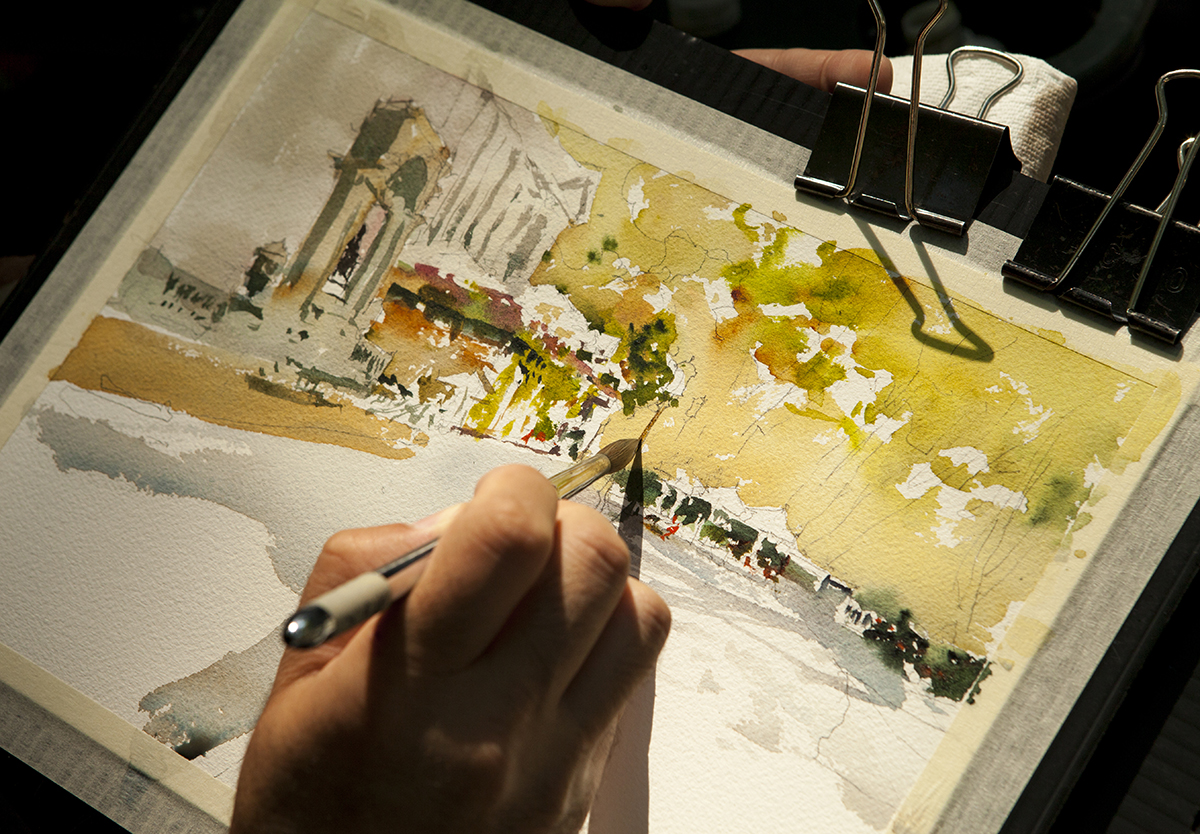 I like to get a lot of mark making out of the one brush – it’s too much trouble to be switching back and forth while sketching on location.