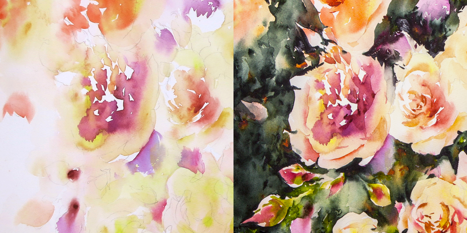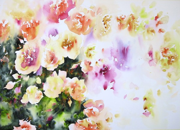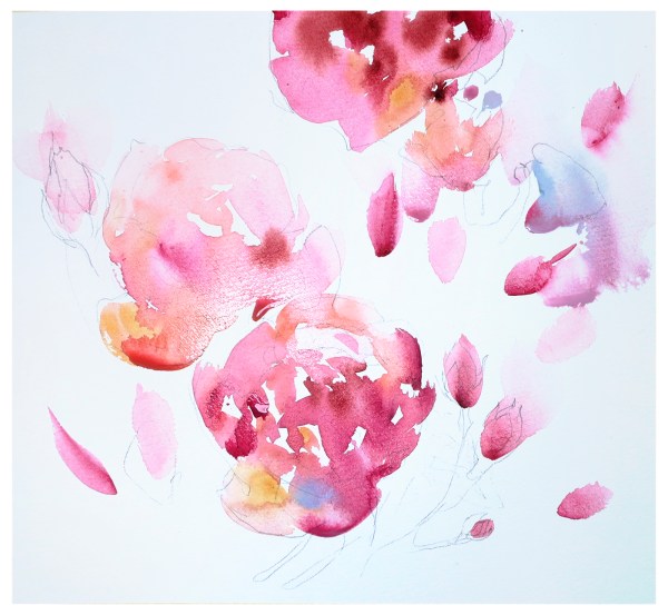 I paint a lot of flowers and the anatomy is so complicated and can look stiff. I like the effect of the watery pink shapes leaving you the option to carve out the flowers in a design pattern with the dark background. It looks so soft and watery as you would want a watercolor to look. Love it!