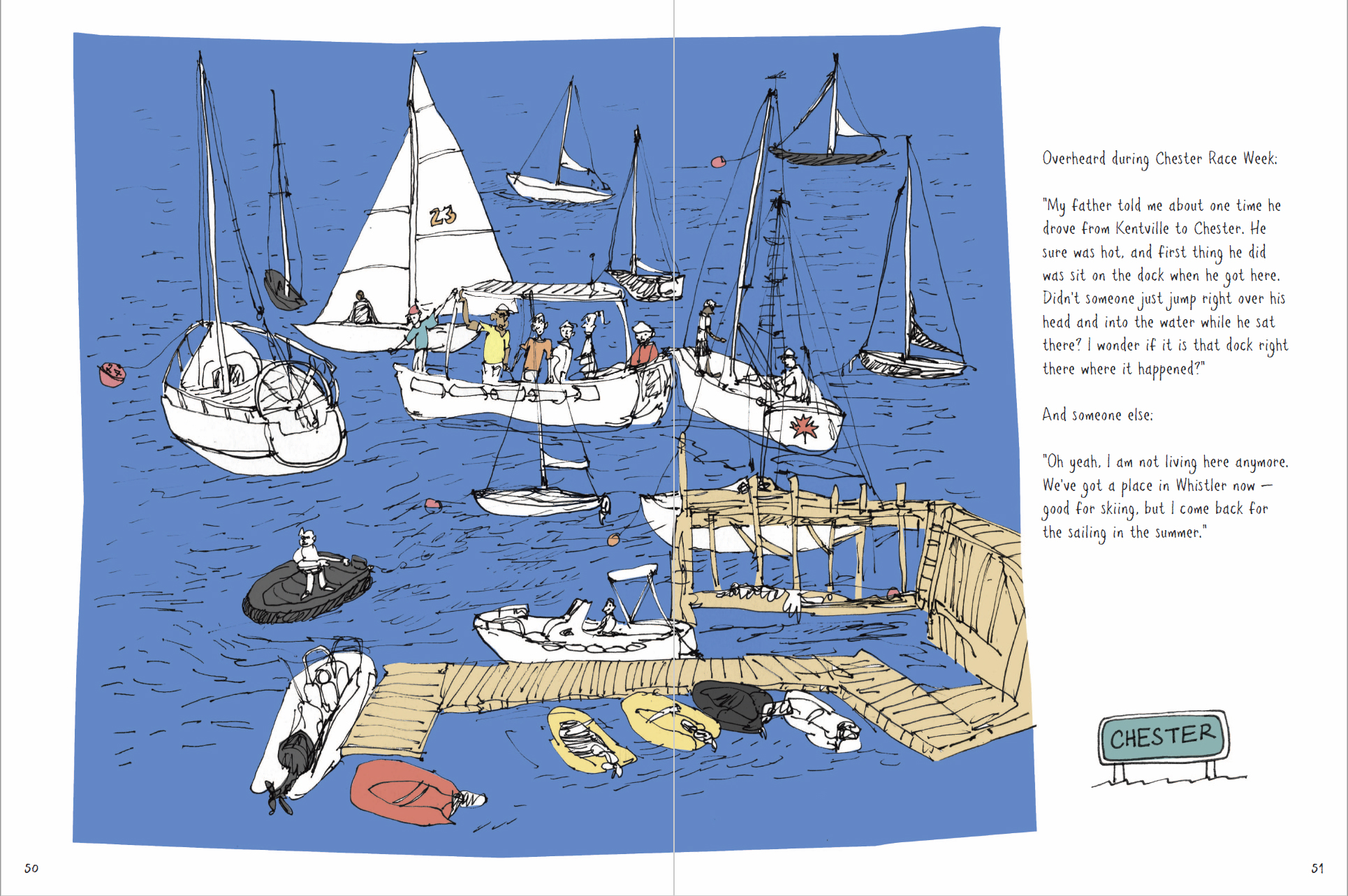 Along the way, she collects stories and bits of overheard conversation relating to whatever she’s inspired to sketch. FitzGerald has an engaging conversational style of writing. She gives us factual anecdotes about the history of the towns and waterways, or short bio’s of the quirky entrepreneurs that work and live in these small communities.  But the highlights for me are her cleverly annotated overheard conversations.