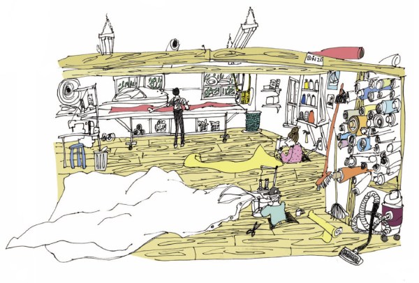 Or a workshop of sail makers who sew while sitting in holes cut through the floor – so the sails can spread out on the floorboards.