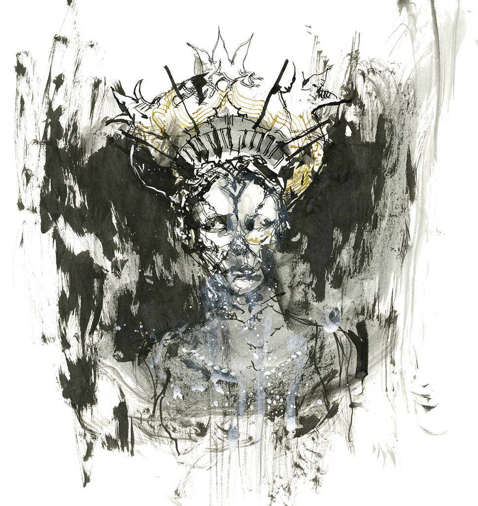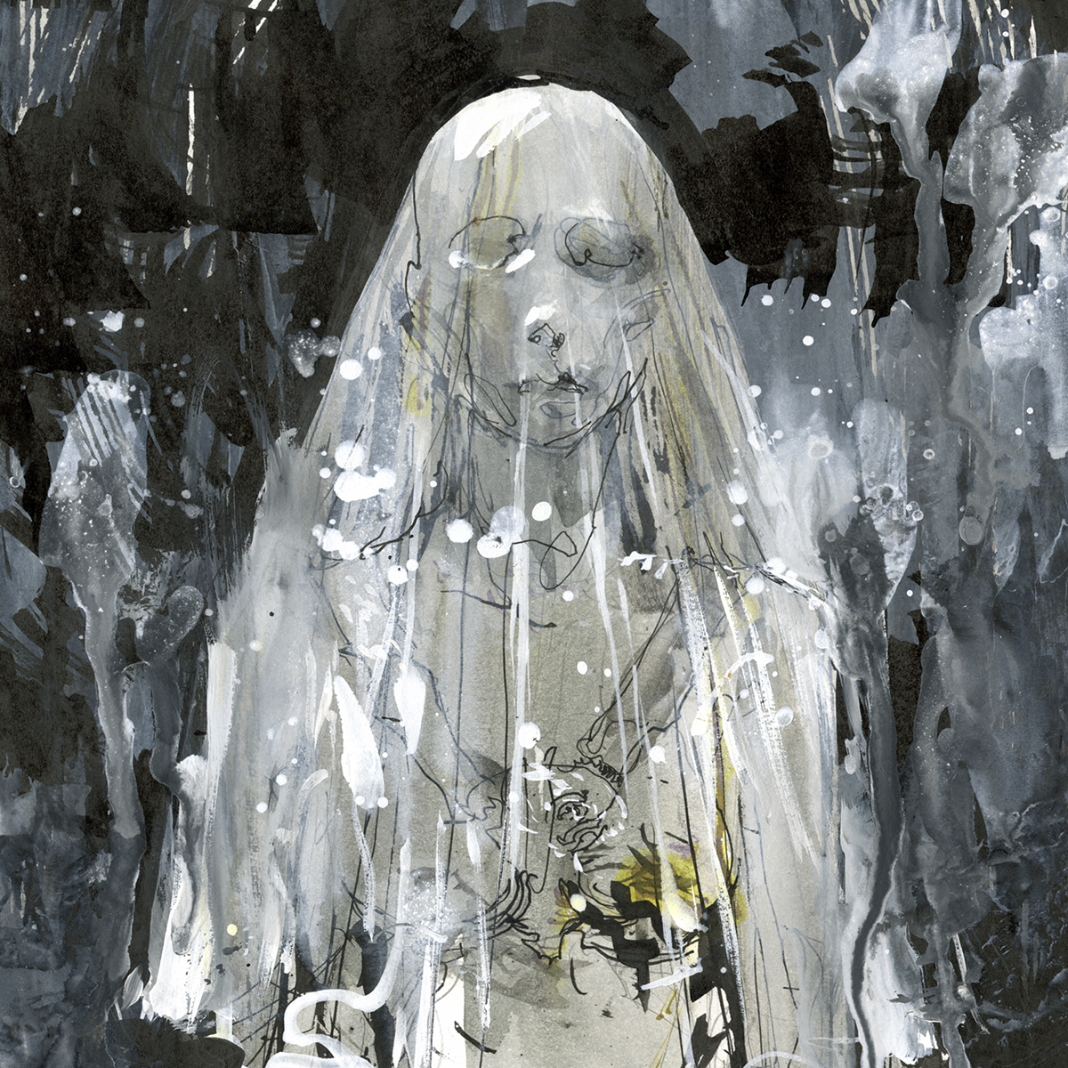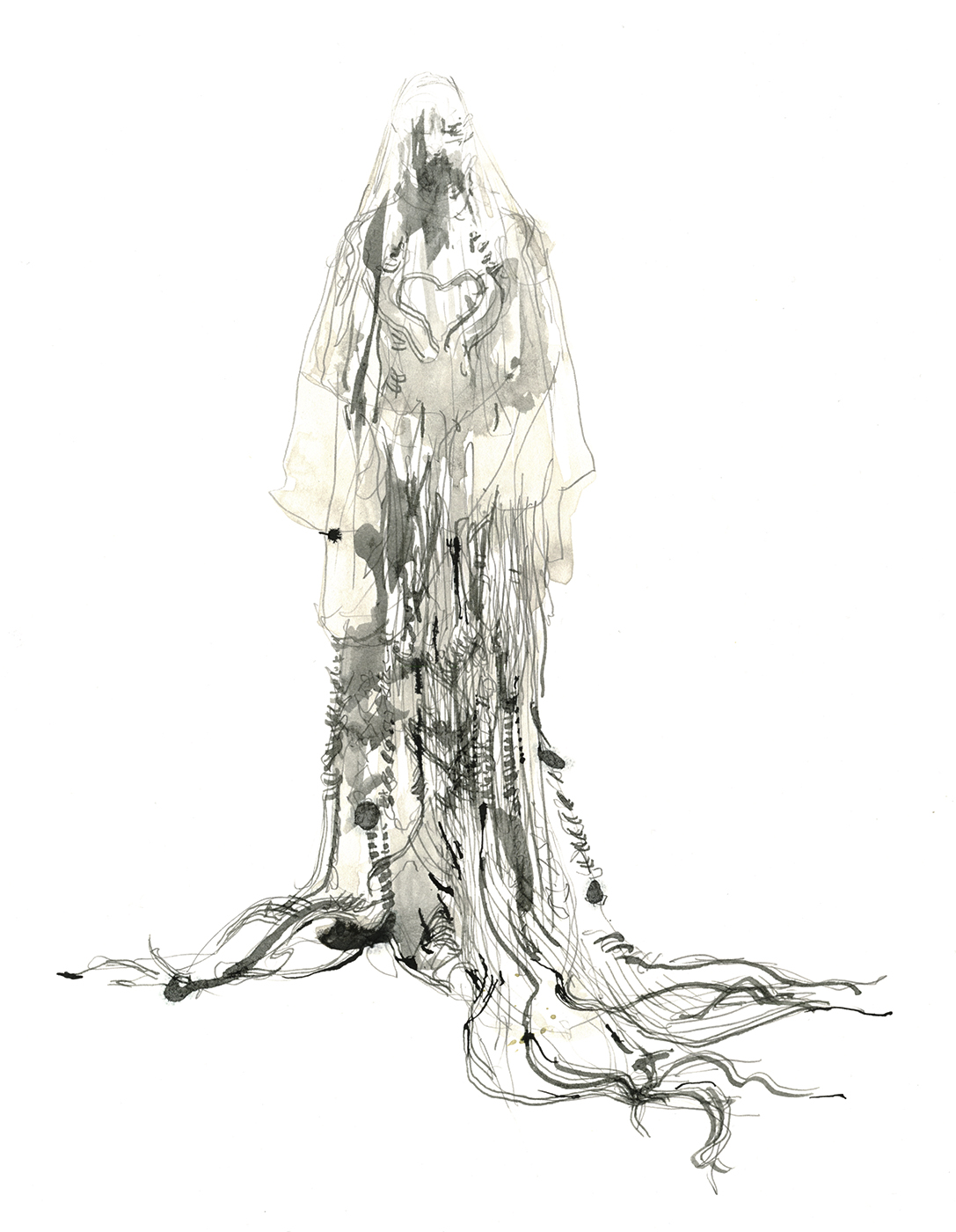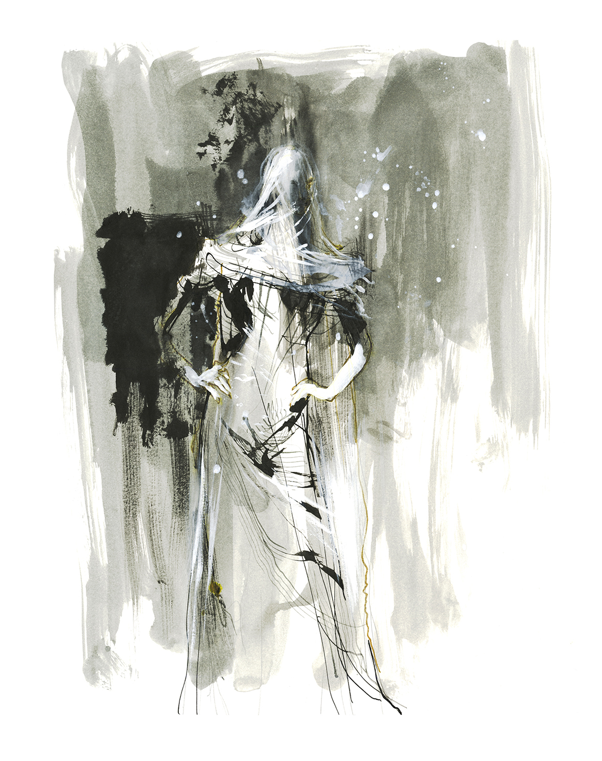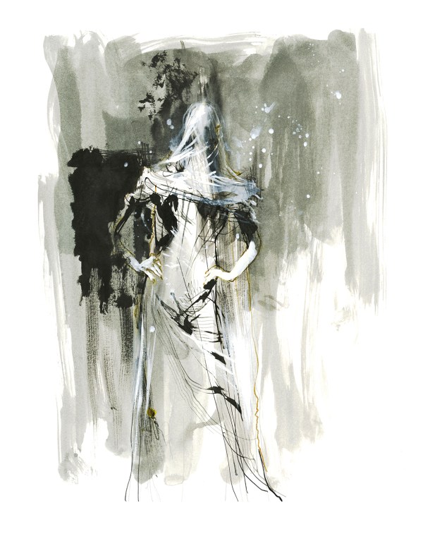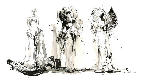 What a challenge to draw all these white dresses with black ink :) But of course here I’ve cheated – using my usual Platinum Carbon Black sparingly, and relying on dilute Lexington Grey, (sometimes just dirty water), Rome Burning (a pale gold) and Liquitex acrylic ink in Titanium White.