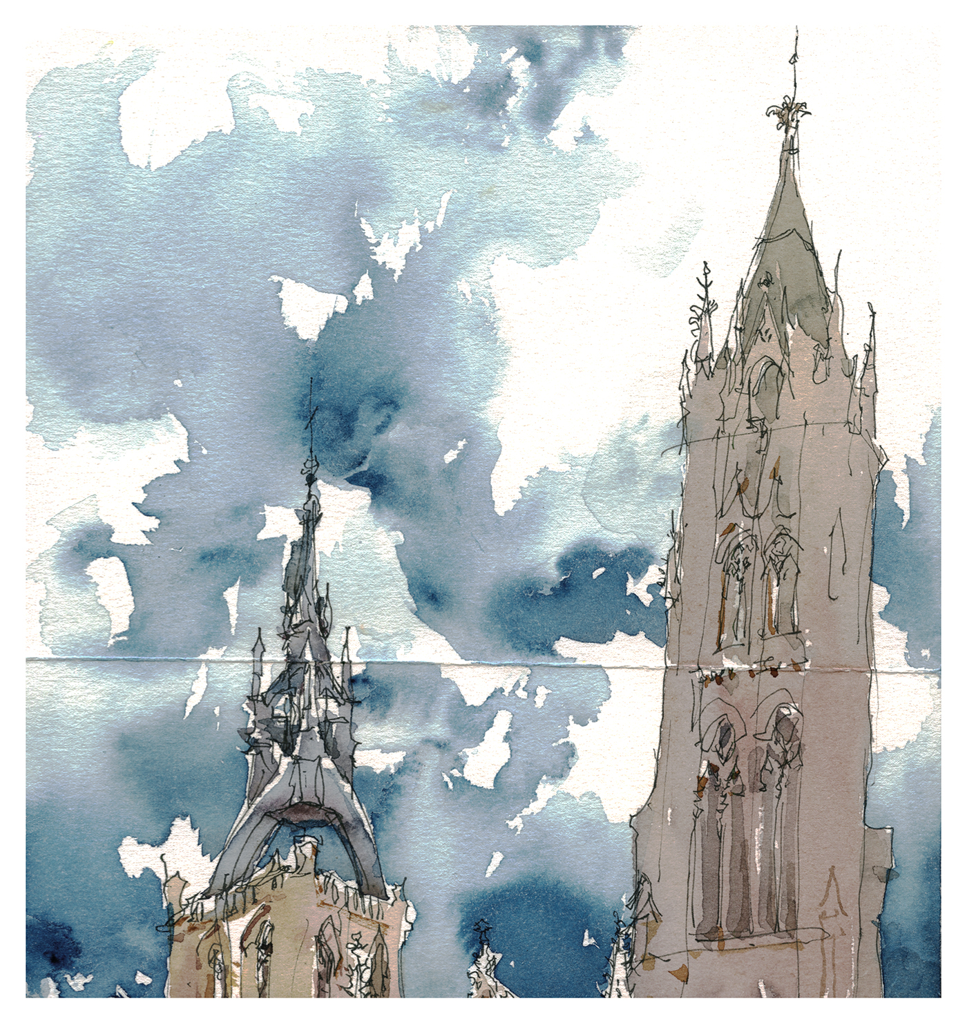 Gorgeous sketch, that stormy turquioisy blue sky against the warm reddish – orangy stone building is a lovely combination (don’t know how to describe those colours)….what a result from a great escape from the store…