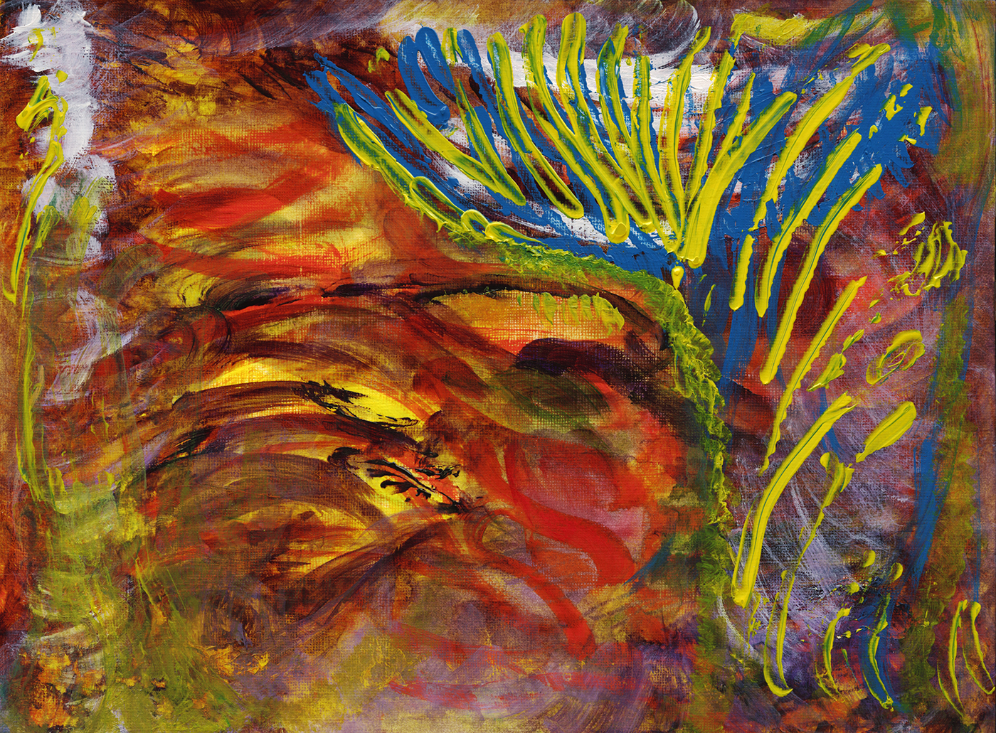 Listenig to your story about your mentally declining stepfather is both interesting and moving. I think you have done a wonderful job collecting some of these very expressive and beautiful pieces of painted art. Perhaps your’re right in the fact that reduction in capacity to speak and communicate otherwise, forces the brain to find a path, and what happens then is a burst of energetic painting. Partly color blind, as you tell, and almost demented I think the painter is a genius. Luckily he has a step-son that can see the worth of his communicative art and share it to the world.