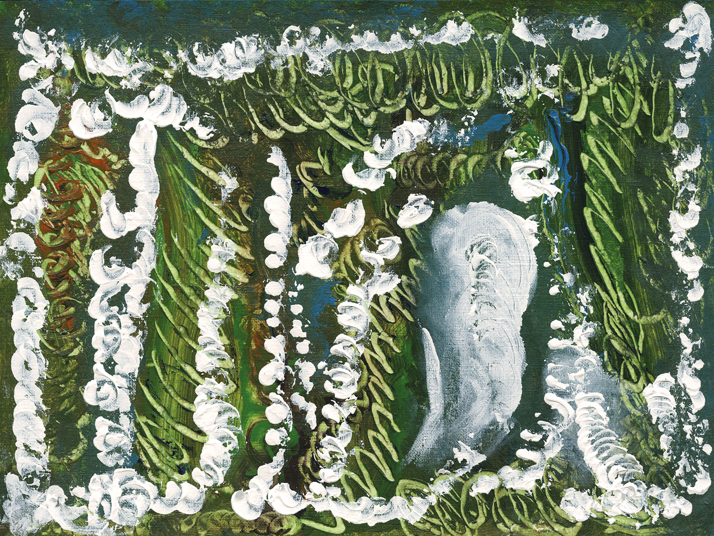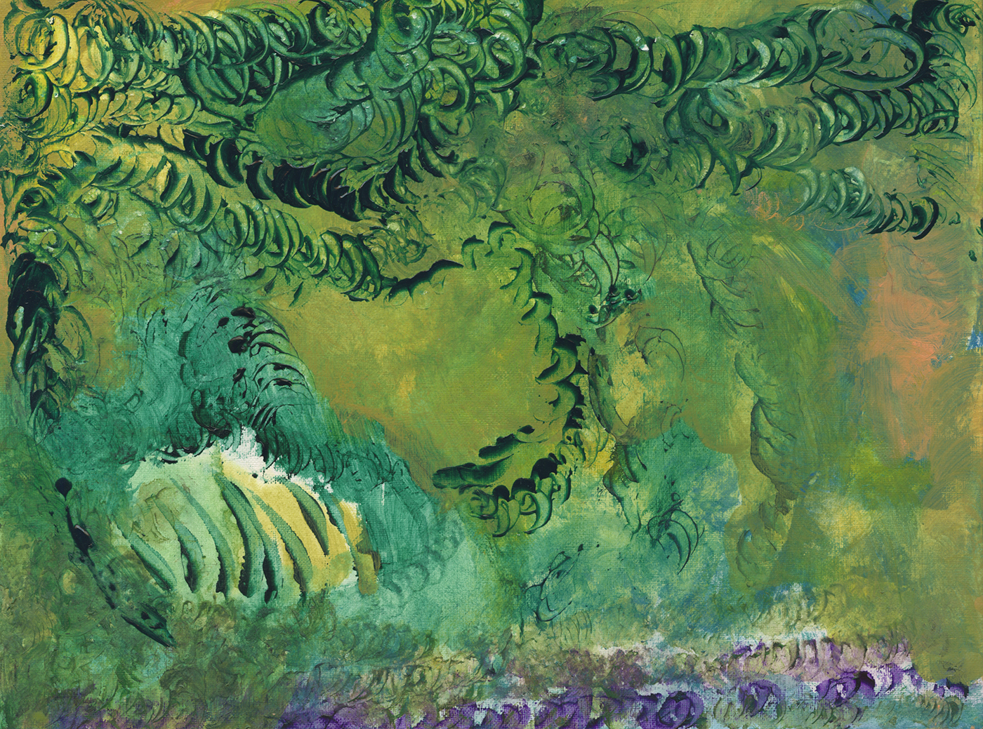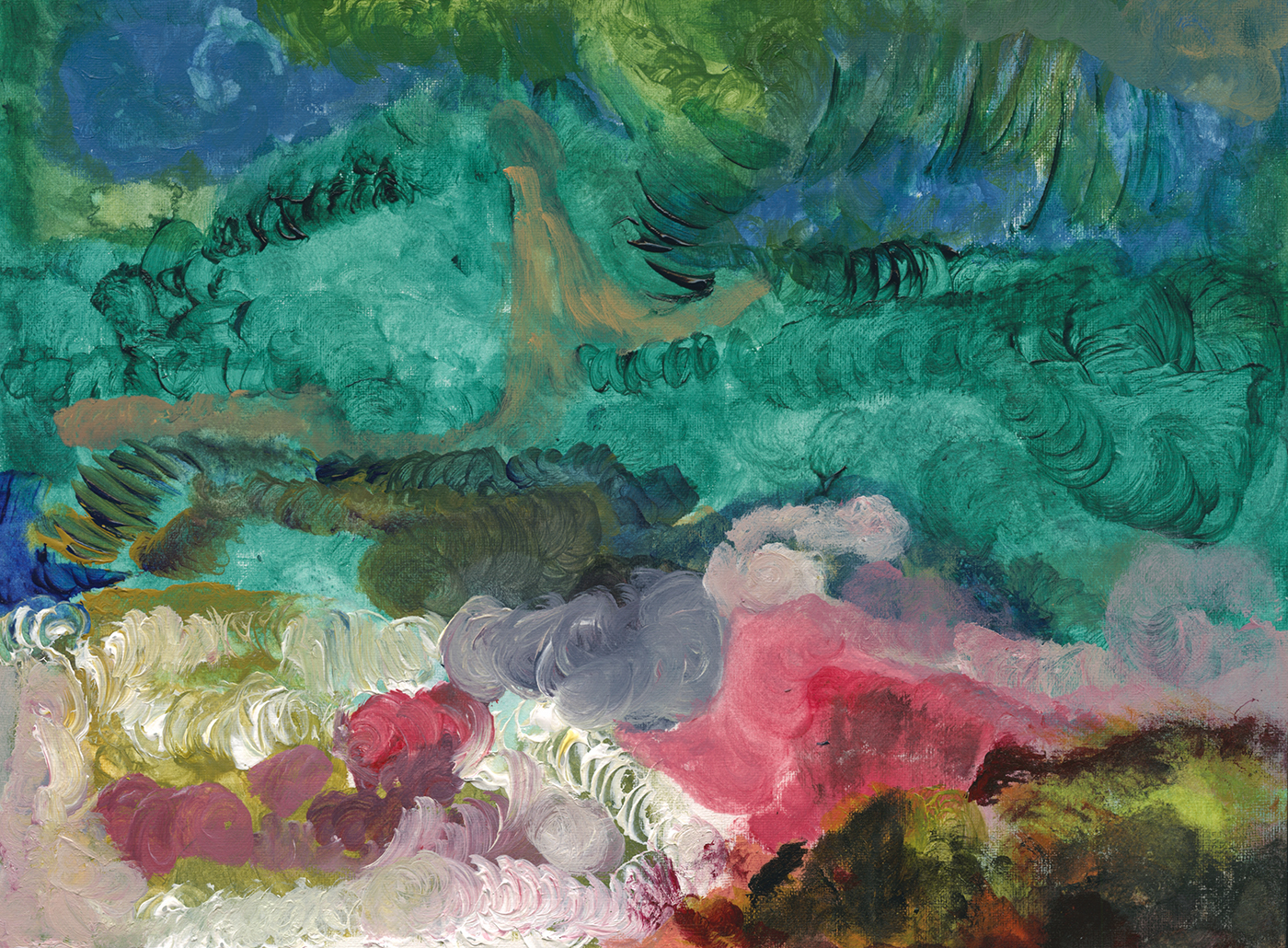When I look at this pale green surface, my realist’s brain wants to see a forest or jungle. It’s attractive because of the color harmonies. It seems like a ‘good mood’ kind of painting.
