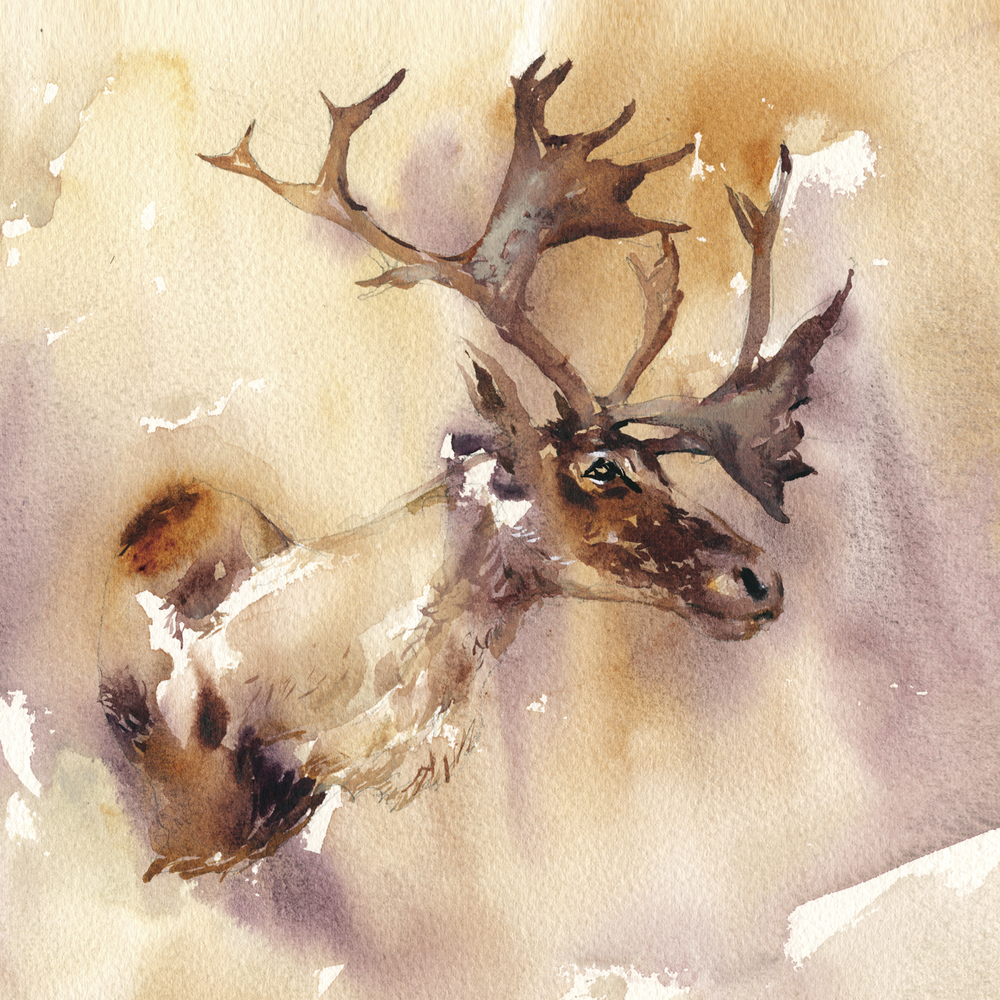 The silhouette of the caribou is all darks on top of the mottled background tone. (Don’t forget to wait for your wet-in-wet undertone to completely dry). The darks are placed, stroke-next-to-stroke so they fuse together – but at the same time, there’s a lot of open ‘unpainted’ space where the background tone shows through. Particularly in the neck and shoulders.