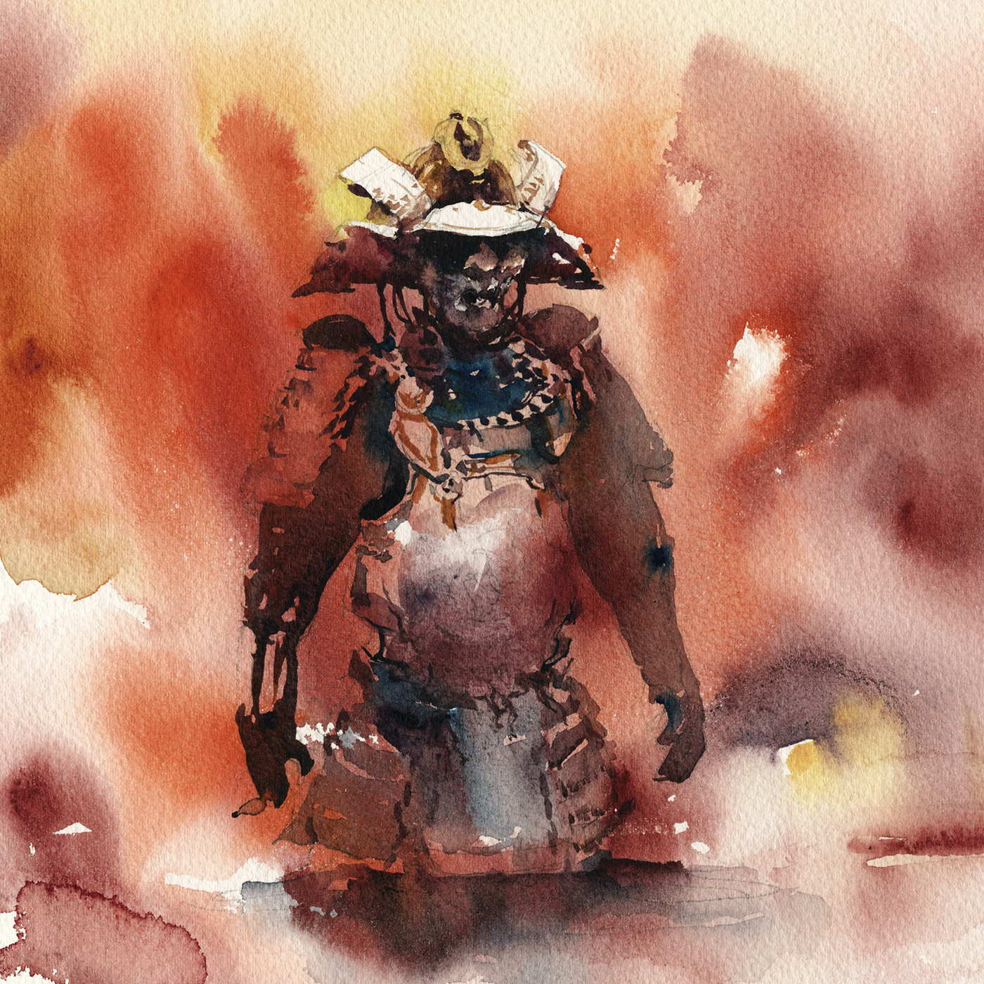 The forward shoulder plate and smaller shapes on the Do (breastplate or cuirass) are negative shapes, but, being a little further from the light, I choose to reserve to the background tone, rather than 100% white.