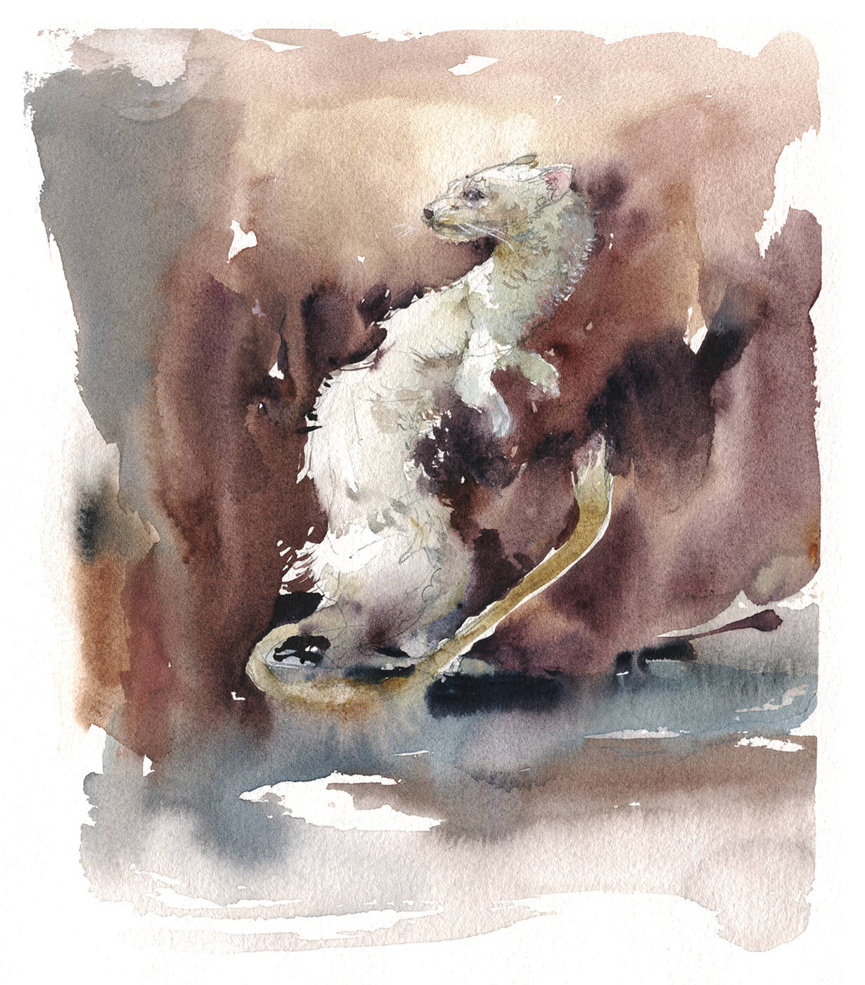 This isn’t completely planned. It’s done by instinct – and sometimes things melt more than you want. I had to use a bit of Chinese White on his front paw, to bring it back into focus. And a few dots of white along the s-curve of the neck.