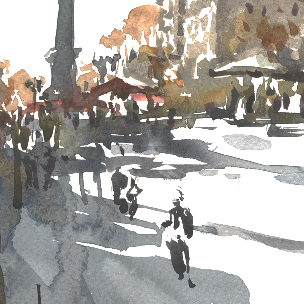 I still find this particular piece to be tentative. A bit of a shy statement. Dry and scratchy in some areas. But! I’m enjoying the brush-work calligraphy in the street vendors, and in all the windows and restaurant awnings on the far side.