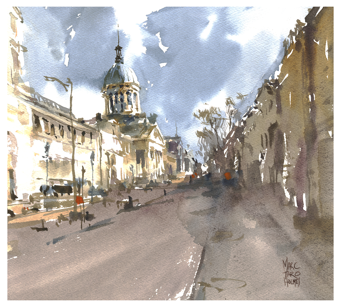 Marc, cannot express how much I am enjoying your 30X30 adventure. The many miles of pen work you have logged in the years I’ve been watching “what you do” via internet/youtube seem to have given you an intimacy/knowing with your urban subjects. Watching you bring that to your (chosen) direct watercolour adventure is very entertaining. Sharing your creative experiences is enriching my w/c journey in a huge way. Each day’s notes are such precious nuggets of how you got there and what you did next and seeing your work (hits or misses…most reassuring to me).