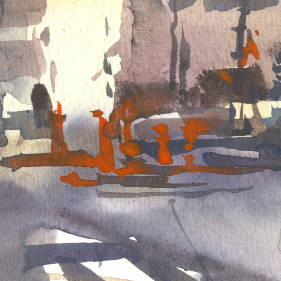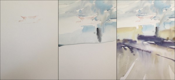 Then washed the sky – very wet in wet – and almost immediately the ground – and this time, I blasted in a honey consistency shadow, while the ground was damp. I think that worked out tremendously well – the shadow is more integrated into the ground than I might sometimes see in one of my sketches.