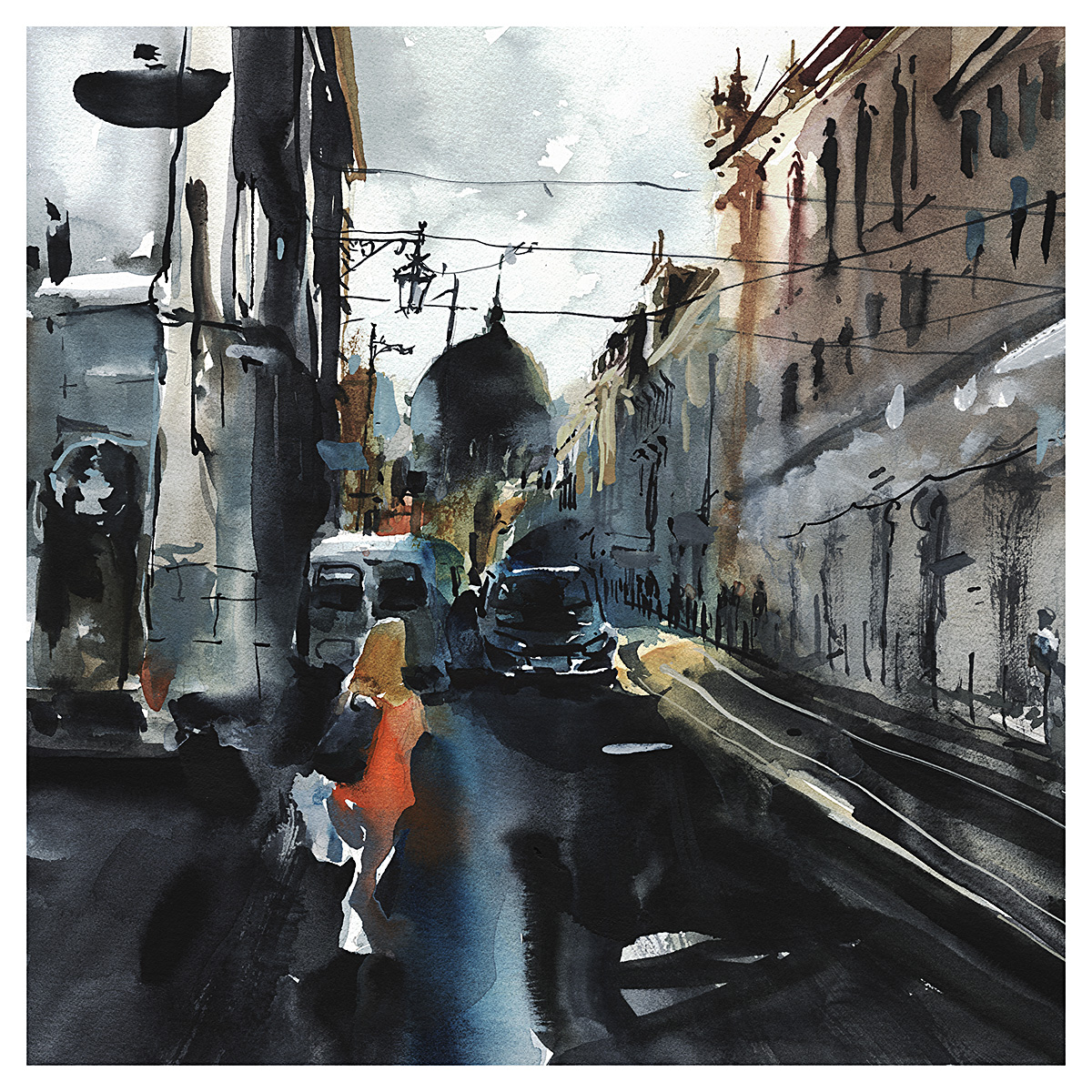 Oddly – despite my stated goal of depth and drama – I didn’t feel right with my first version. It felt kind of shouty? Perhaps it’s the lone figure stepping tentatively out into the road. But something made me immediately feel – I should tone it down.