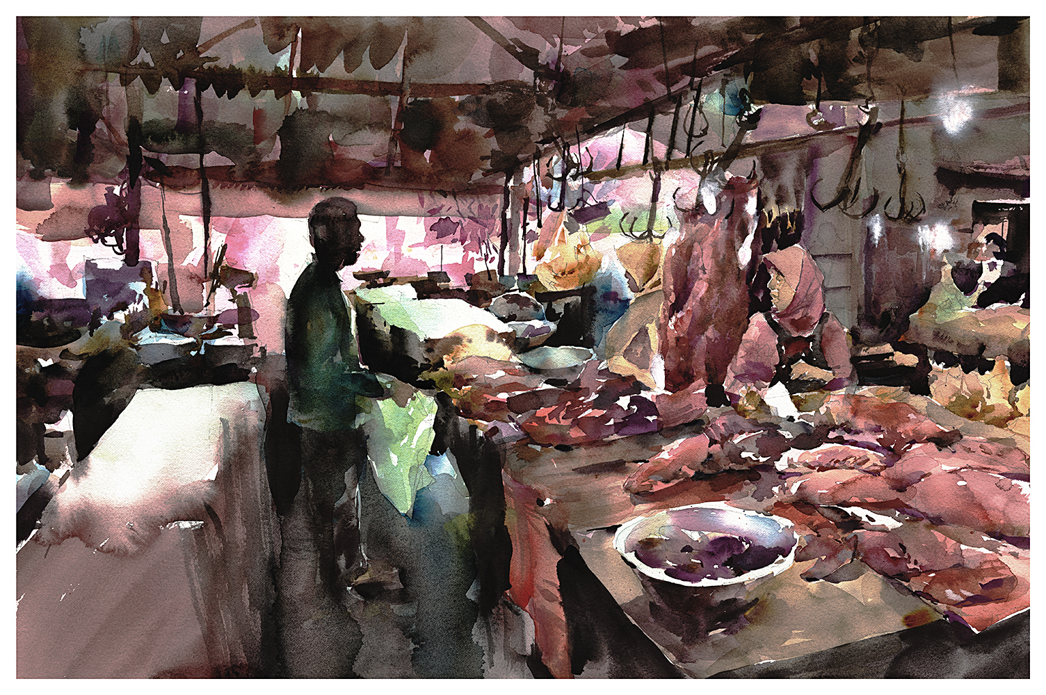I approached it like an alla prima painting. There was a loose gesture sketch on the paper. Next a light wash of the pinks under the whole sky and ‘meat’ table. Then when that dried, I just began blocking shapes. One at a time, trying to paint the final color in one go. The close up of the fan kind of shows it best. Blocking “Fused Shapes” over top of the base wash. Much like an Alla Prima oil painting. I didn’t realize it, but the time I spent with Direct Watercolor lead me to oils, and now, going back to watercolor, it’s becoming a unified theory of panting :)