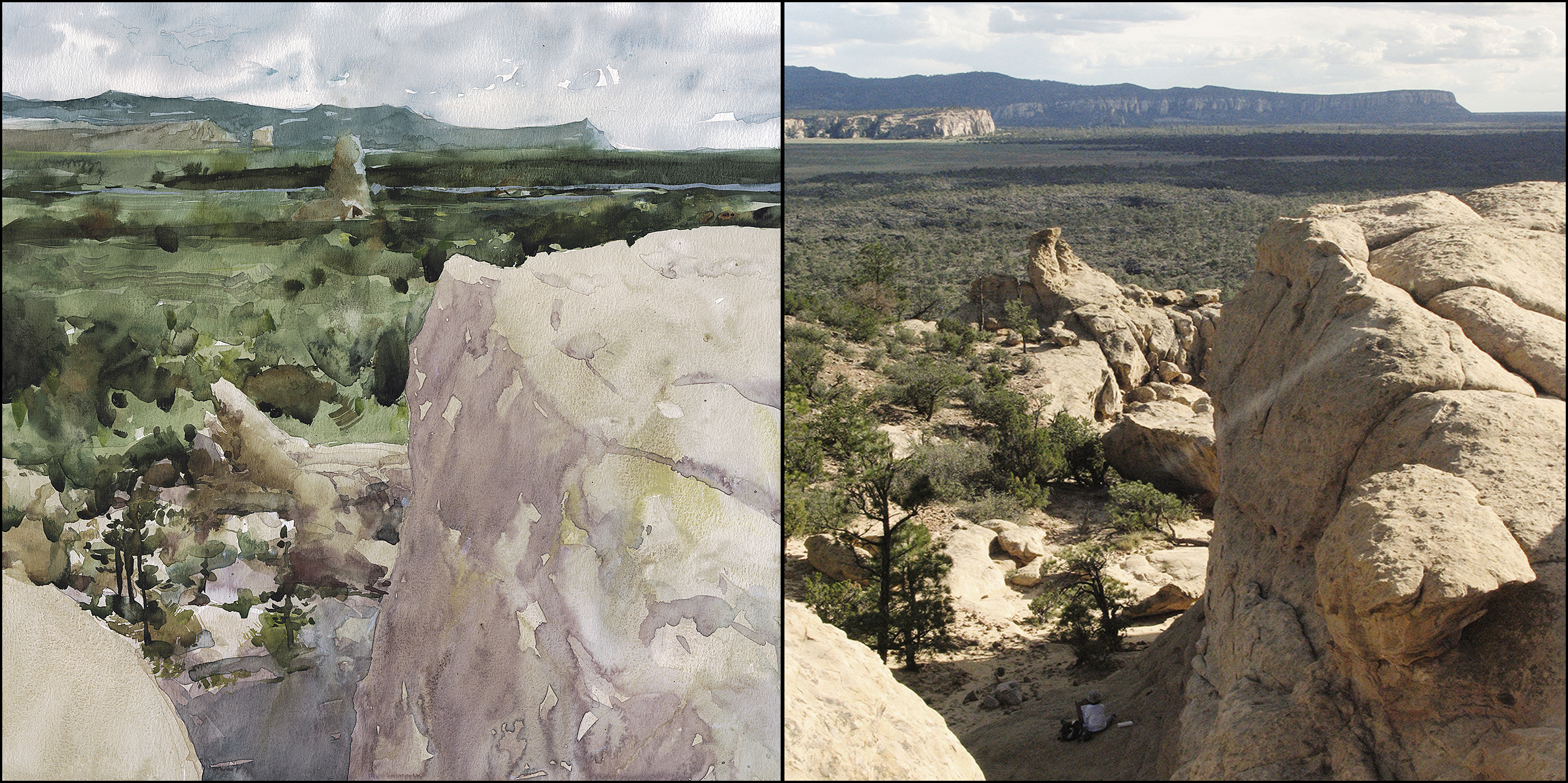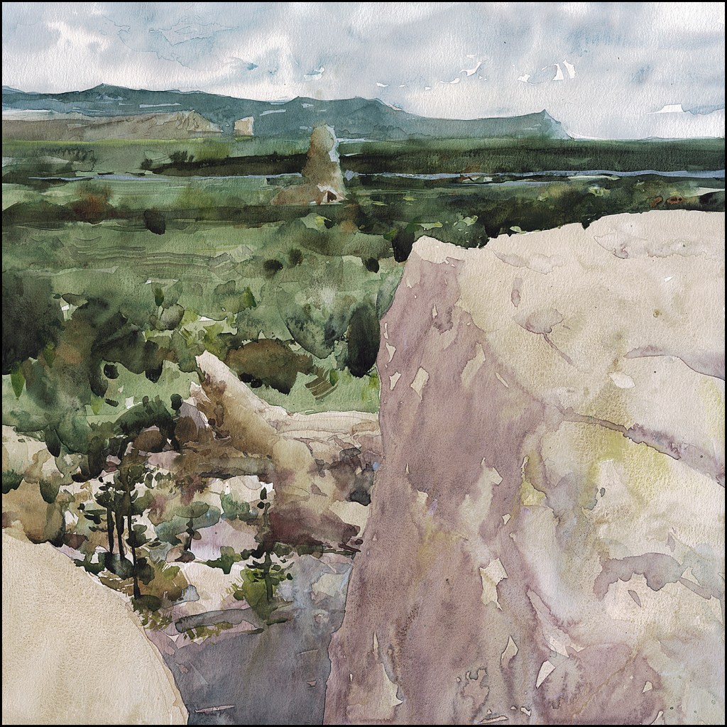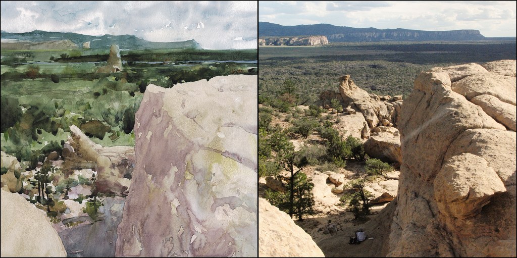What’s changed? There’s color choices of course. The painting is cooler over all. The photo was close to sunset, and I may well have processed it in the past to be more golden. With this watercolor, one of my big concerns was the huge shadow in the foreground. I made it pinkish, instead of grey. I think it suggests some kind of bounced light – and it relieves what might have been a huge dead spot right in the middle of the frame.