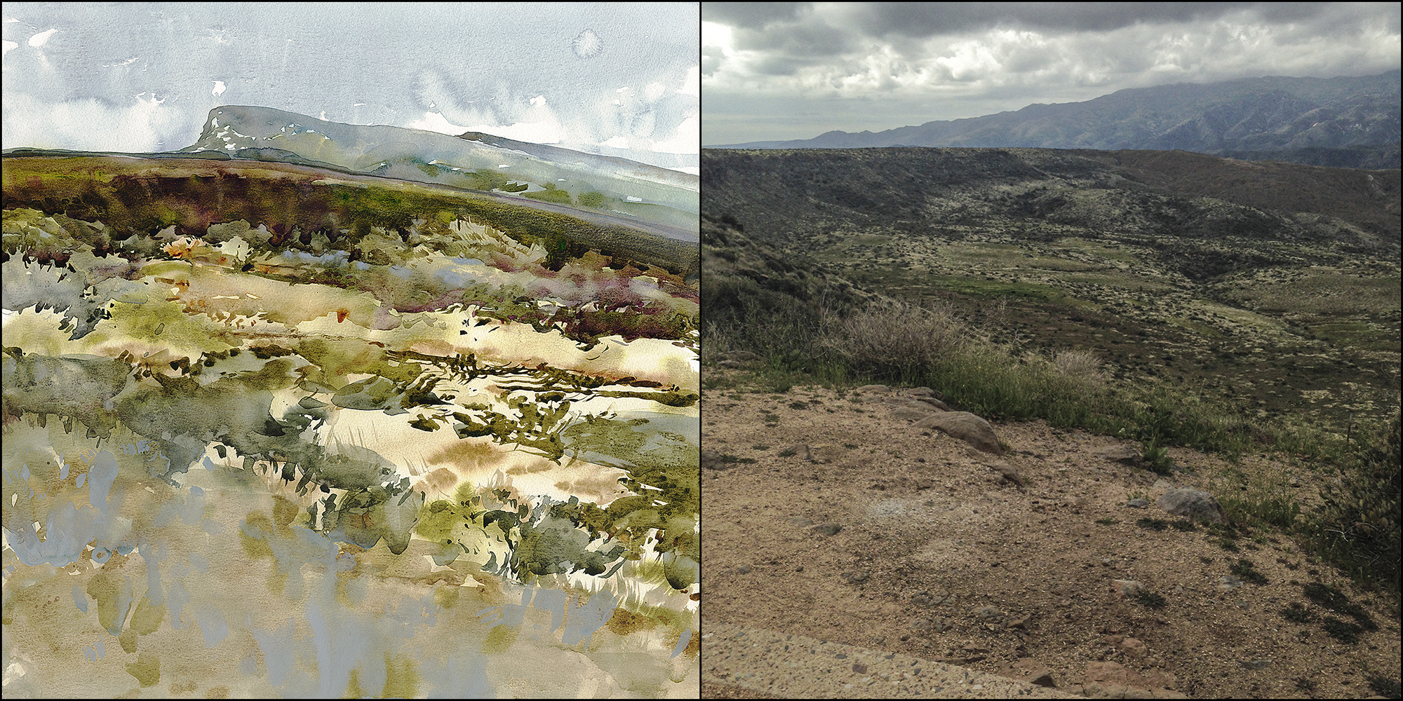 I live in Northern California and have been working on some landscapes with our local oak trees and golden (dead) :-) grass. The glowing cream color you’ve created in the patch near the middle of the Dry Brush Arizona painting has the color and glow I’m looking for. What colors did you use for the light area and the darker wet in wet section within it?