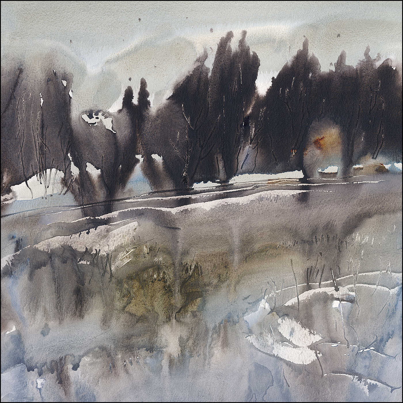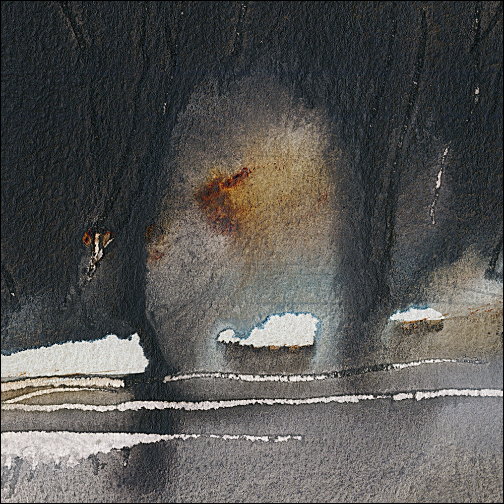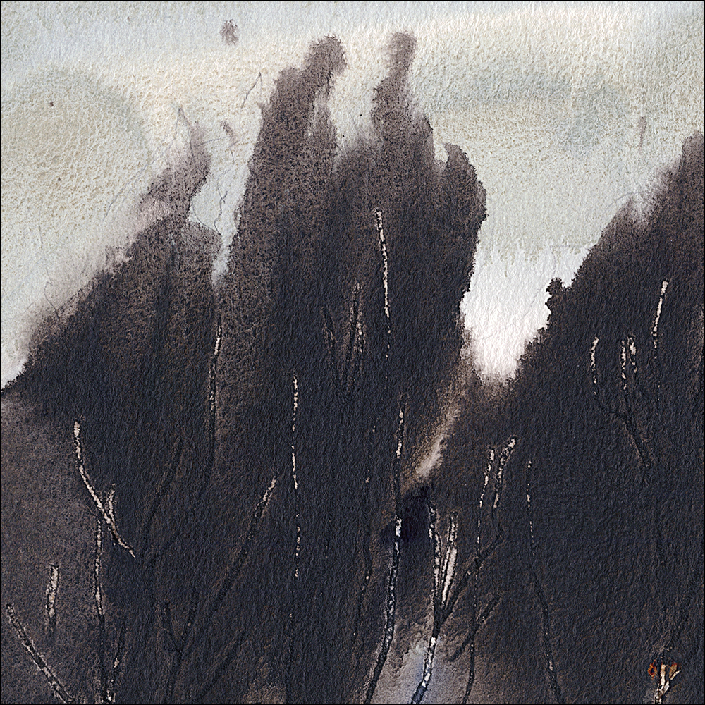 Here’s a reserved white shape. Normally I would have these all along that row of trees, making them sharp and well defined. This time, I wanted the entire tree line to soften naturally. To melt into each other, and into the sky.