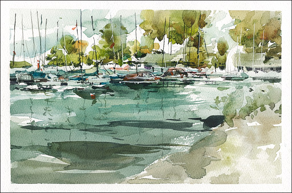 Once you know you can do it with nothing but the brush – it’s tremendously freeing. I used to draw everything. Every window, every fencepost. I used to draw lines around clouds or reflections in the water! I was a line-addict! My sketches were stiff and overworked. I used to draw individual leaves on trees for heaven’s sake! Don’t do that please. Life is too short :) The trees here are a good example of using direct painting and drawing at the same time.