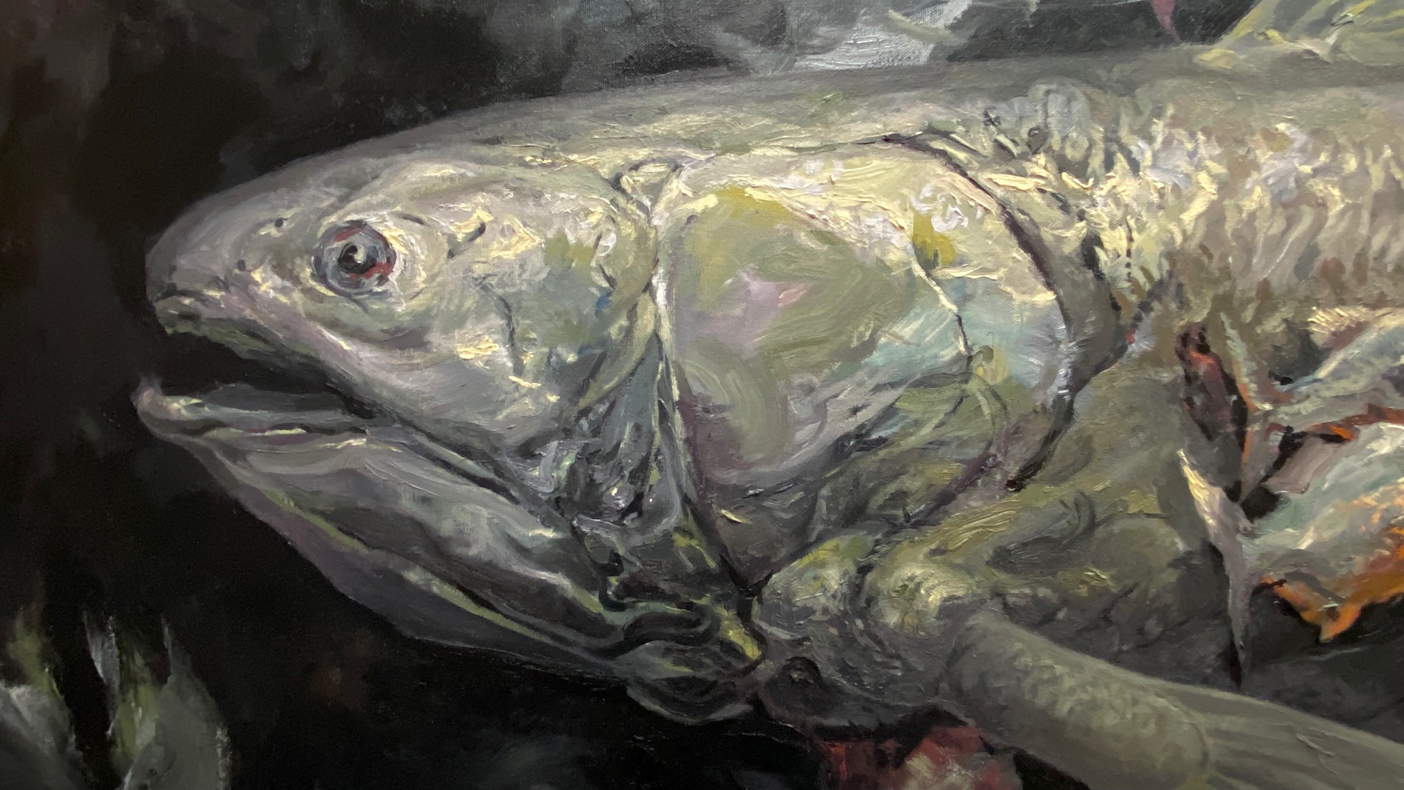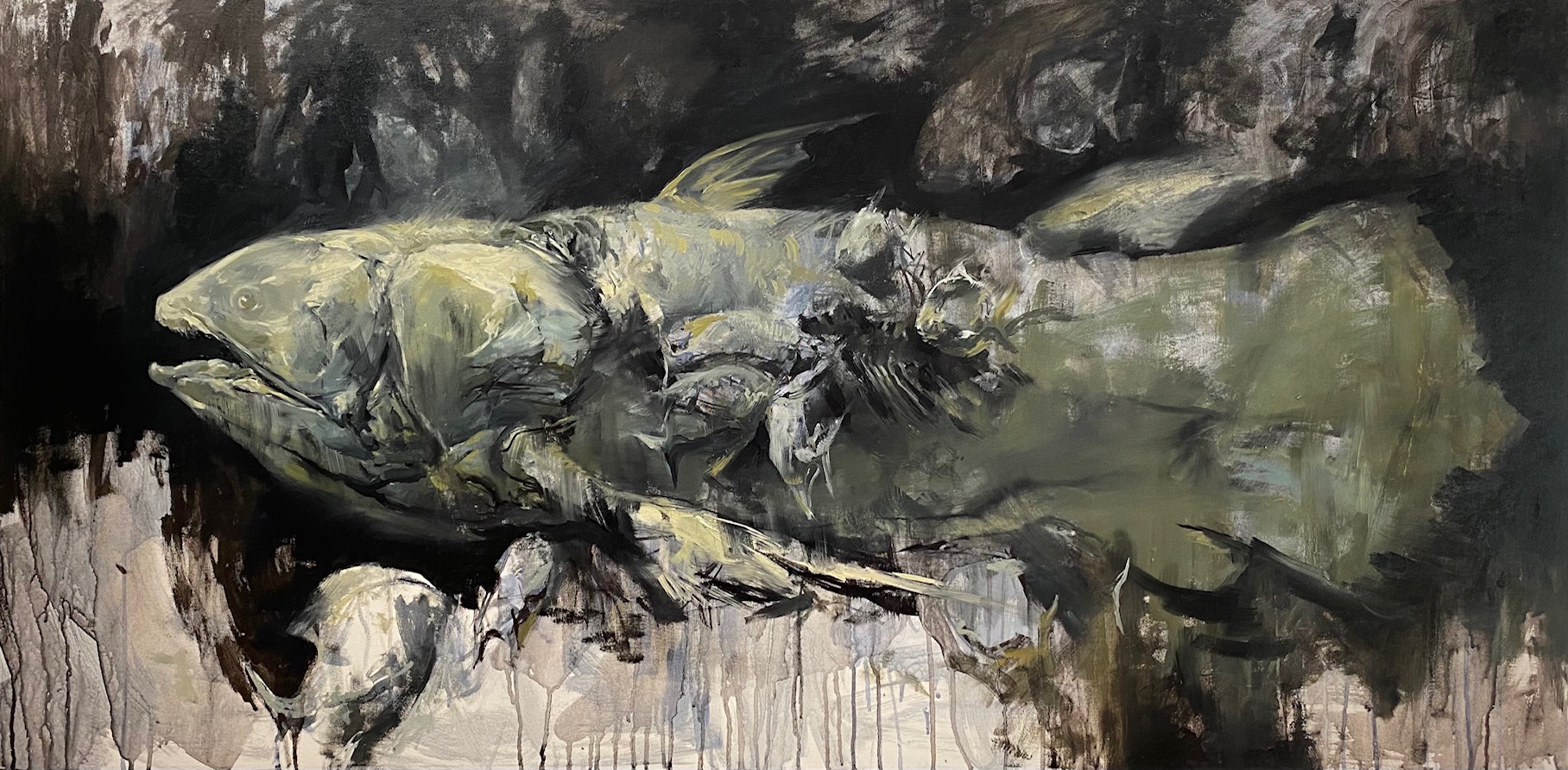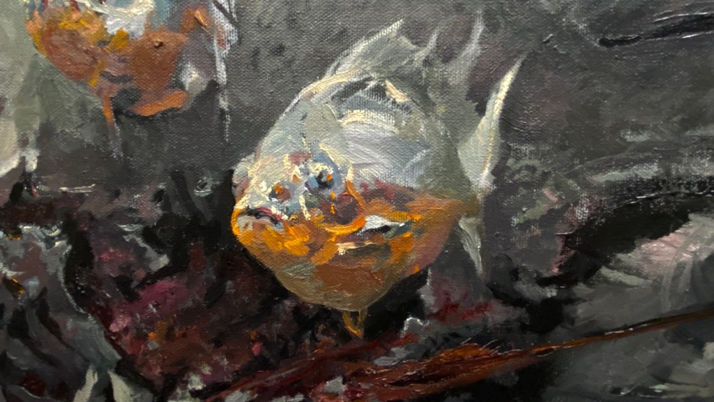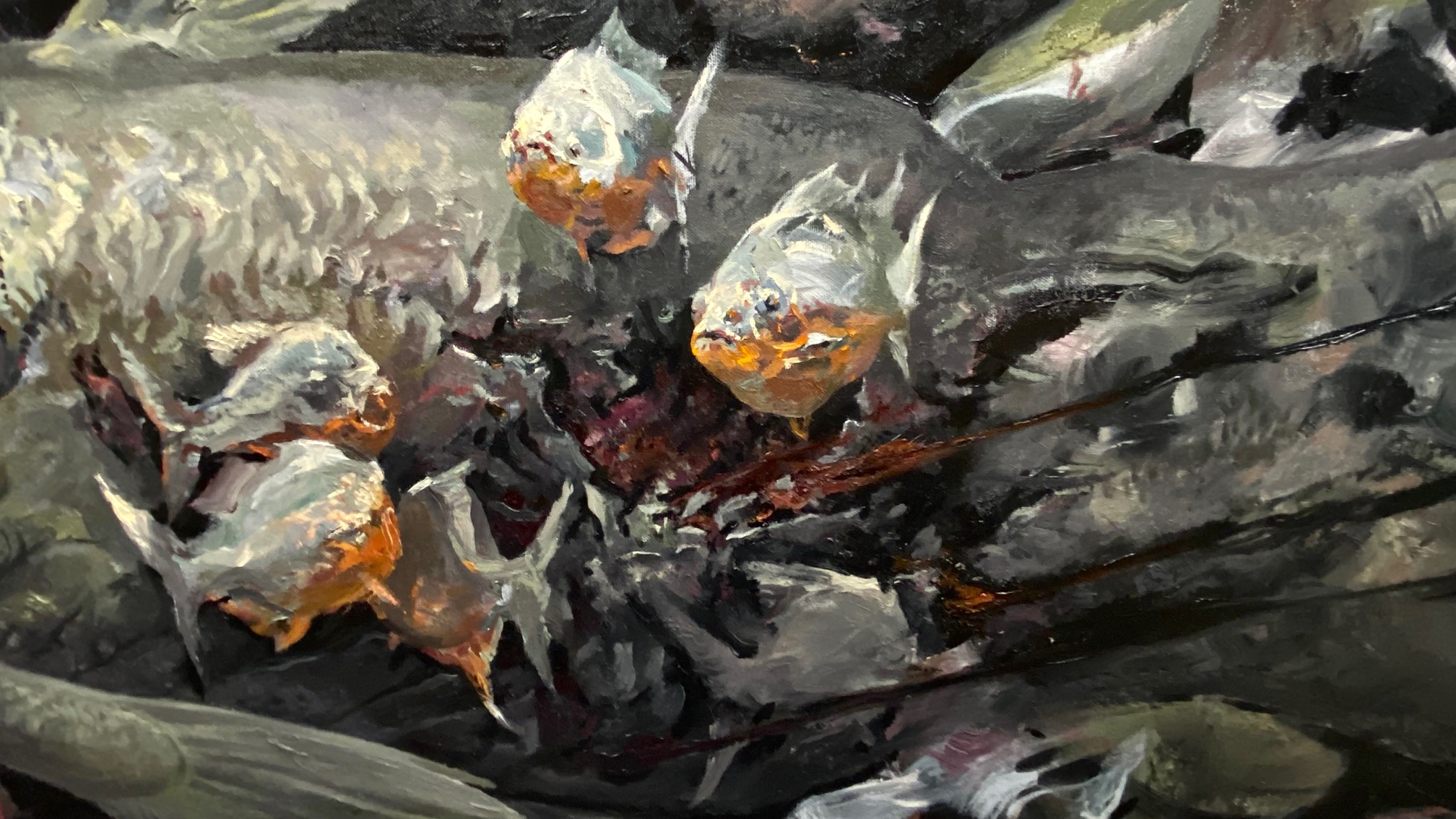 Well, I have always liked the Coelacanth, which is an armoured fish, probably and ancient species. It was thought to be extinct, but then it was rediscovered – which is a great symbol of natural resilience. The smaller fish (piranha), eating the larger – those could represent any number of forces in the world, whatever you see as the things chipping away at society or the world. Be it greedy humans or even negative thoughts. The things that wear us down and feed off our energy. So that’s the story behind the painting! Thanks for asking :)