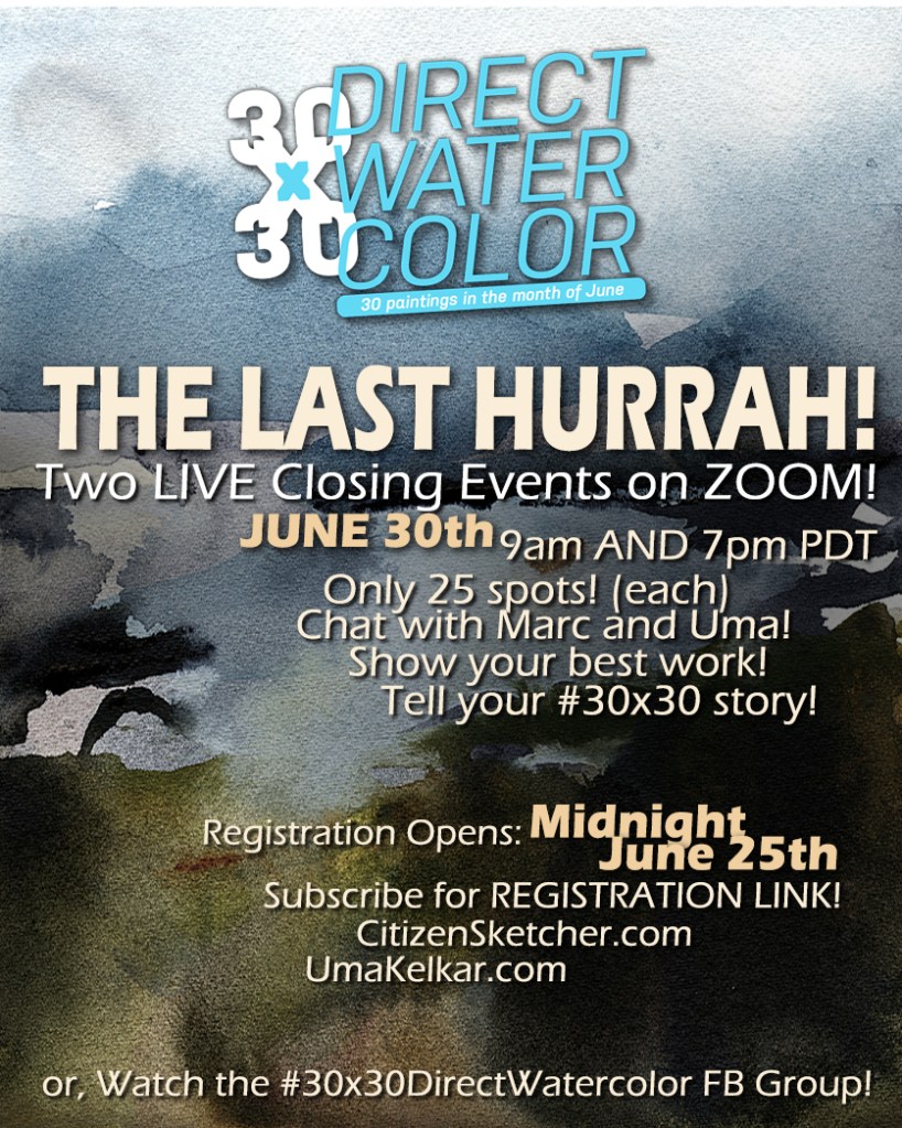 The ‘zoom-social’ was a lot of fun in previous years. It’s basically a big show-and-tell. Participants show us their favorite piece from the marathon, (or the one you most want feedback on), and tell us a bit about what you learned, or the projects you invented for the marathon. Some of the themes and challenges people come up with are brilliant. I’m going to try ‘Painting in 20 touches’ myself.