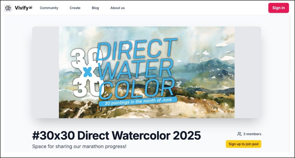 So please head over to the Vivify Pod; #30×30 Direct Watercolor 2025 whenever you have a chance. (A ‘pod’ is what they call a shared space on Vivify:) You can use your existing google profile with ‘one click’, or create a new Vivify account and password. Just hit the yellow button in the lower right corner to get started.