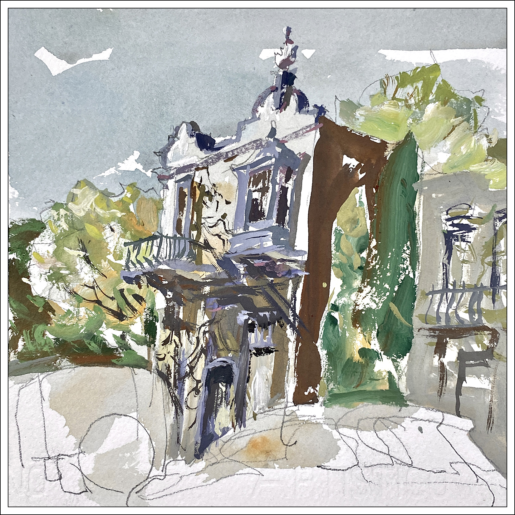 For me, whatever it takes to have fun with it :) I sometimes like to do a really fast one to get it out of my system, then a second try can be more calm and collected :) If you find the details are overwhelming, try drawing something from much further away. Like – paint the big church from all the way across the park – so it’s almost the same height on your paper as it is in your view. If you can’t even see unnecessary details you won’t feel pressed to put them in :) :) Hah!