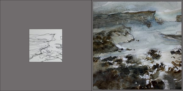 I’m still doing miniatures watercolors (+ white gouache) – but what I actually did first was a few pages of 2×2″ thumbnails, and enlarged my six favorites to a *gigantic* 5×5″. Hah! It actually feels spacious after 4×4″