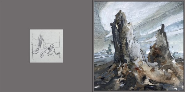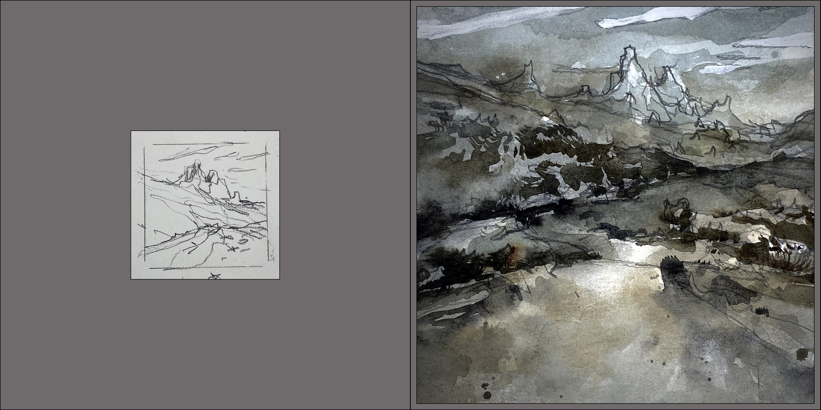 My thumbnails are, of course, just pencil doodles. What I *should* have done, if I really wanted to be doing Notan, is black and white watercolor / gouache. Ideally you want to be visualizing entirely in ‘optical weight’ rather than in line.