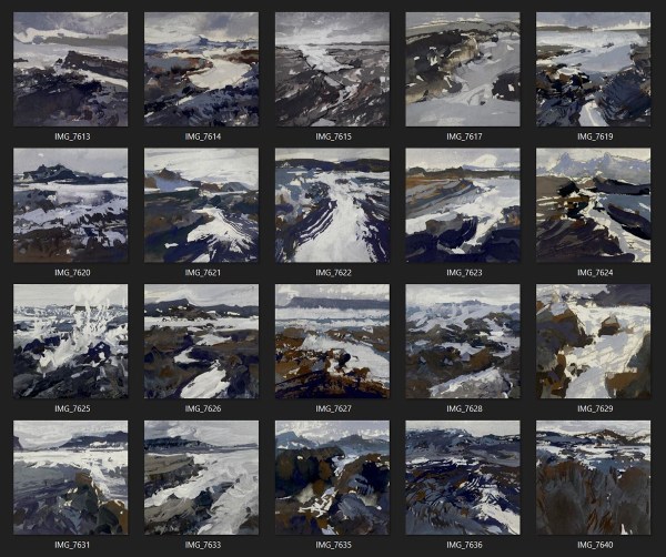 Wow Marc. You are prolific and energetic. I don’t know how you can work ‘so small?” That’s super difficult for me. I love #5 because of the lighter colors of brown, the winding river & horizon line, then #9 because of the location of the horizon line (with a light city scape?), the “road?” at the bottom middle leading the viewer into the painting, and #12 with the lower horizon line, stormy sky and winding river leading the viewer into the painting. Beautiful work! I think putting them all together in a large gold frame is a great idea.