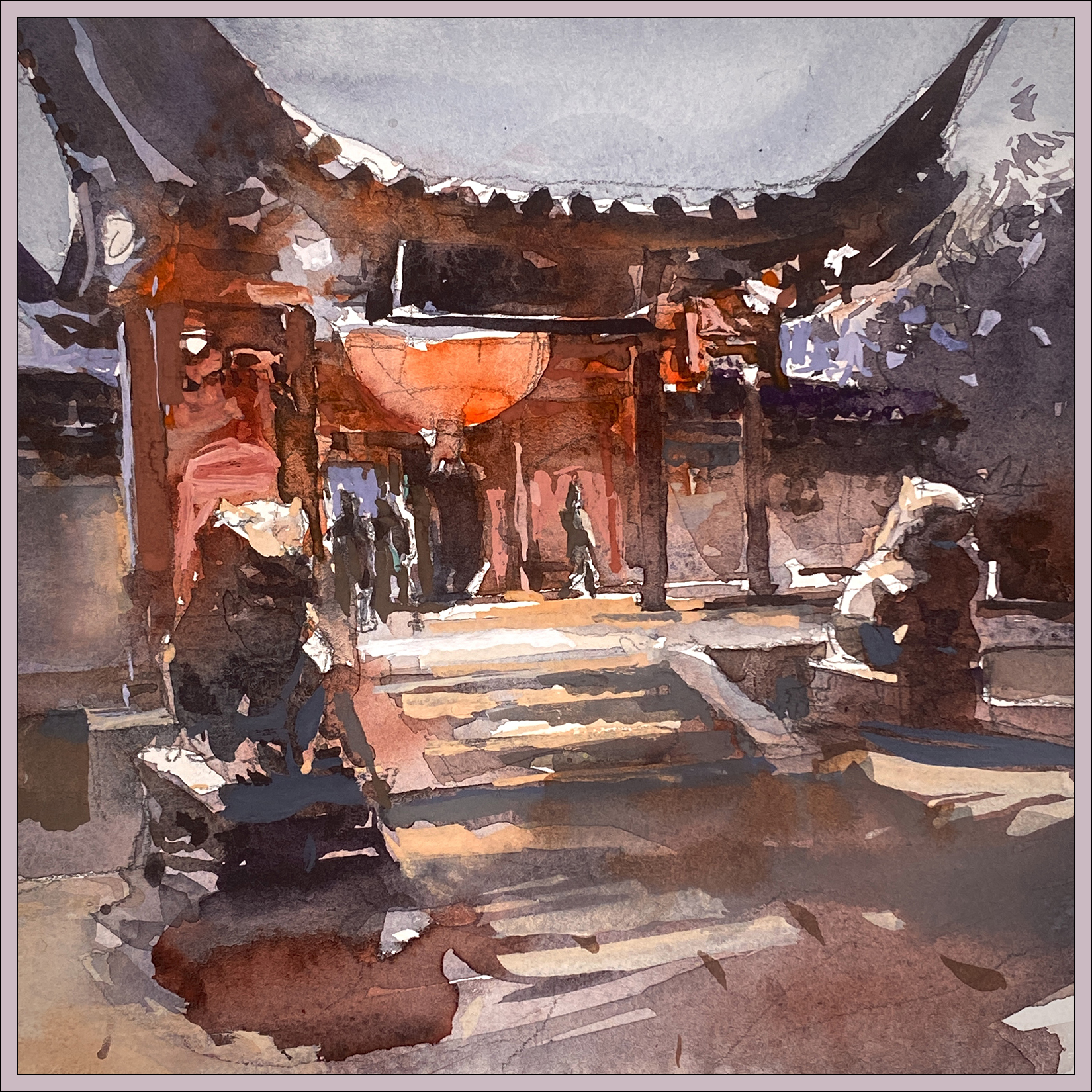 Here’s a speedy 8×8″, of the Chinese pavilion in our Montreal botanical garden, during the festival of lights last October.