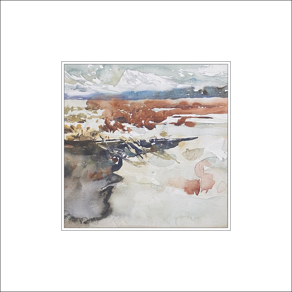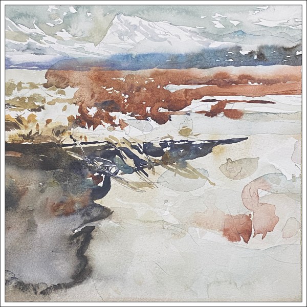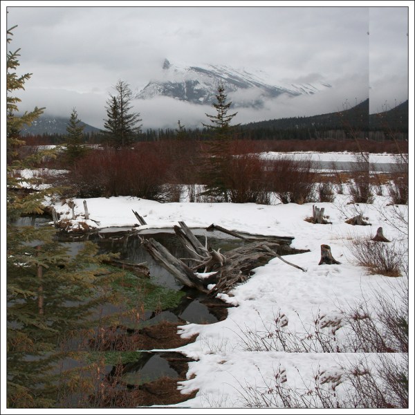 Sketch from an old photograph of Laurel’s, from the last time we were in Alberta and had a chance to drive up to Banff. I’ve always loved this view – with the red twigs of the dogwood bushes being the only real color in a wintery scene.