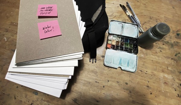 Some people get (or make) a small sketchbook with close to 100 pages – or a pair of books – sketchbooks are getting thinner and thinner these days. Lately I always start with a stack of cut sheets. All I have to do is whittle down this pile of paper!