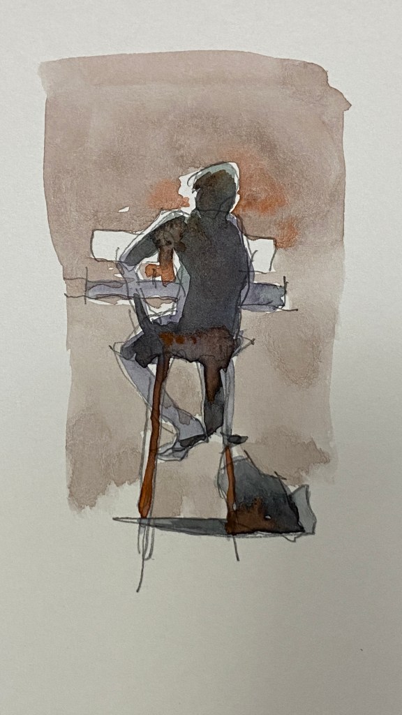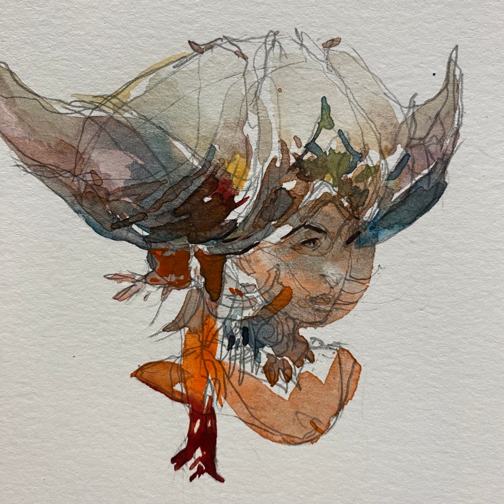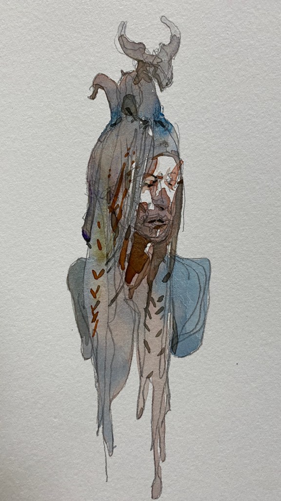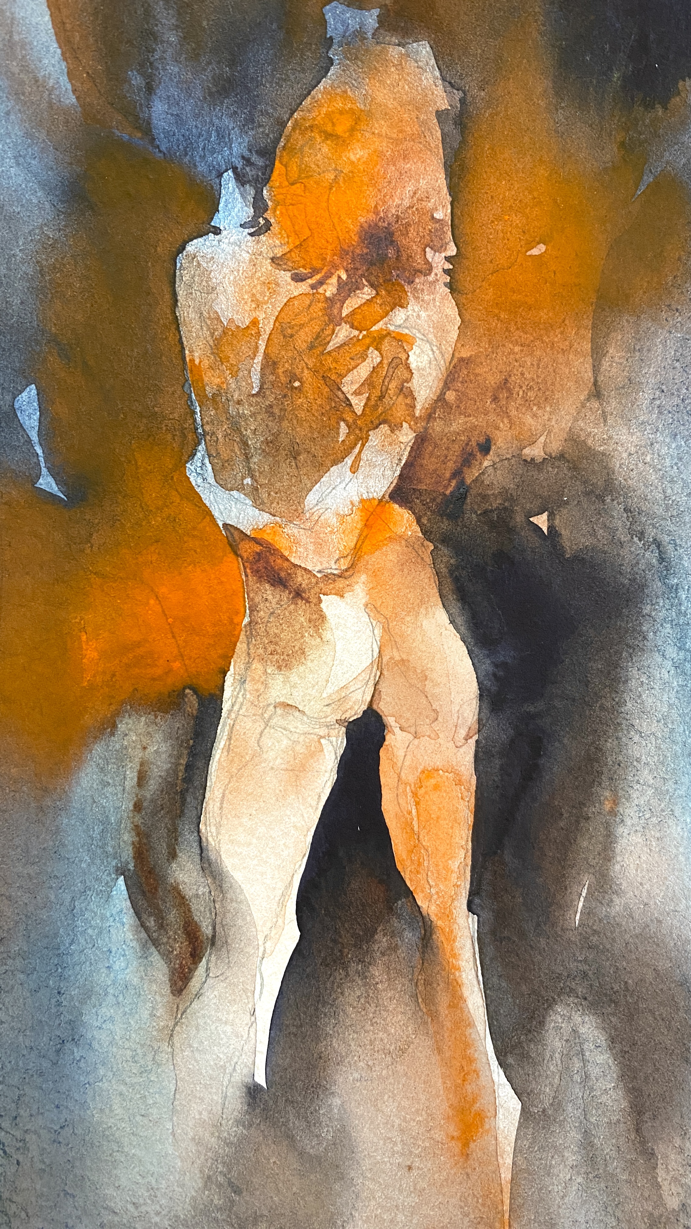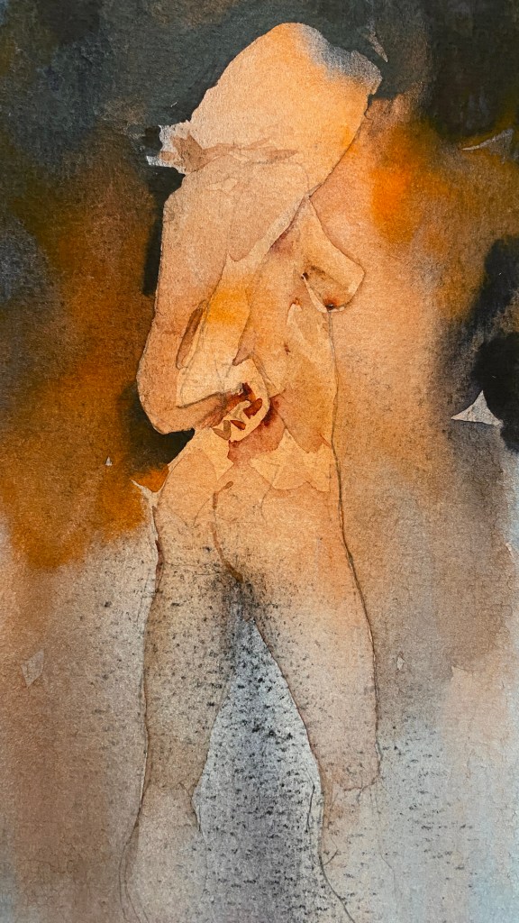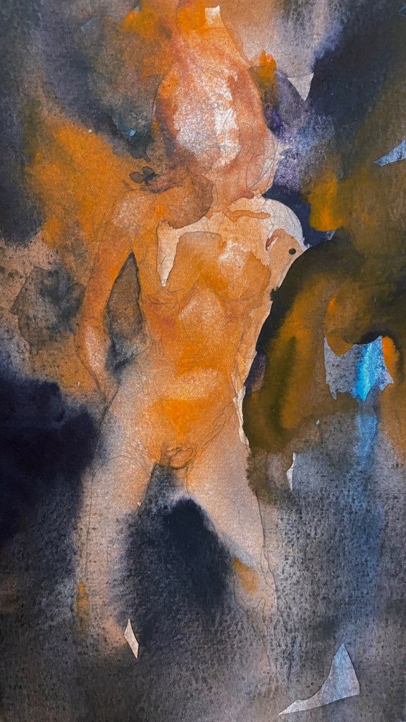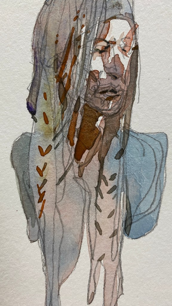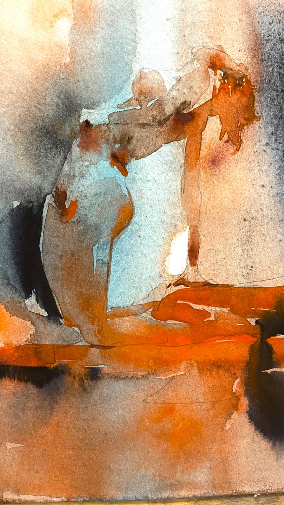 I made a first pass that’s completely wet and wild, using 2″ flat to flow color onto these 6×9″ pages. Then came back with selective wet-on-dry blends, pushing and pulling edges, seeing if I can bring the figure back into focus.
