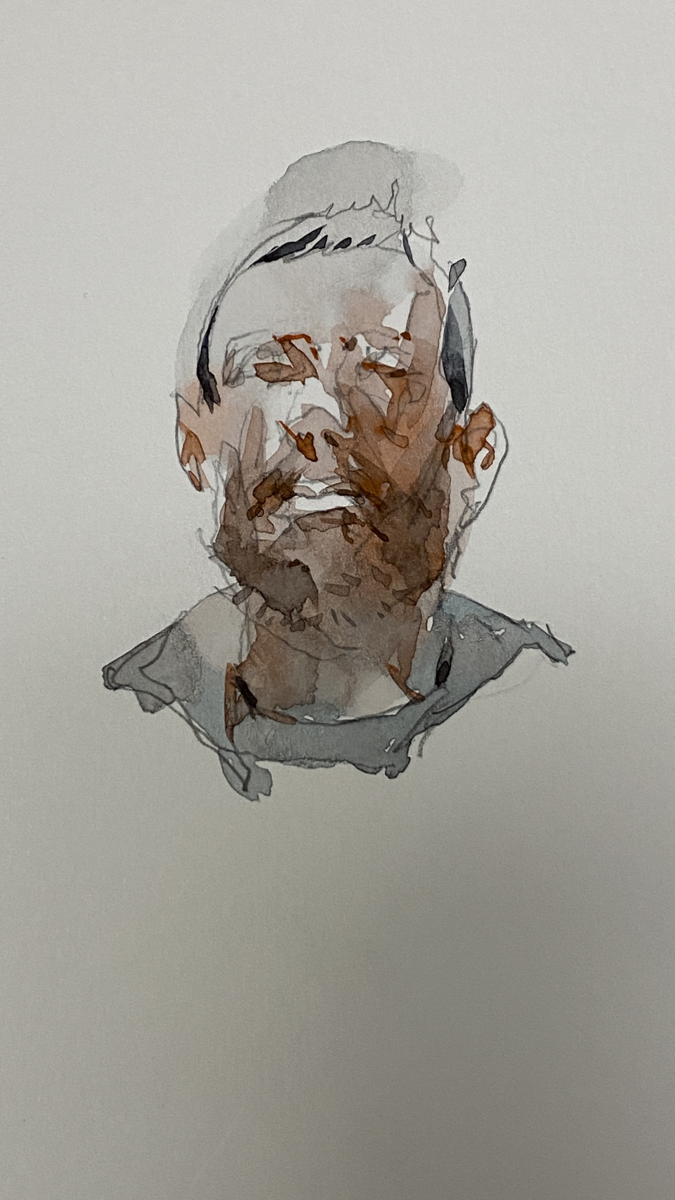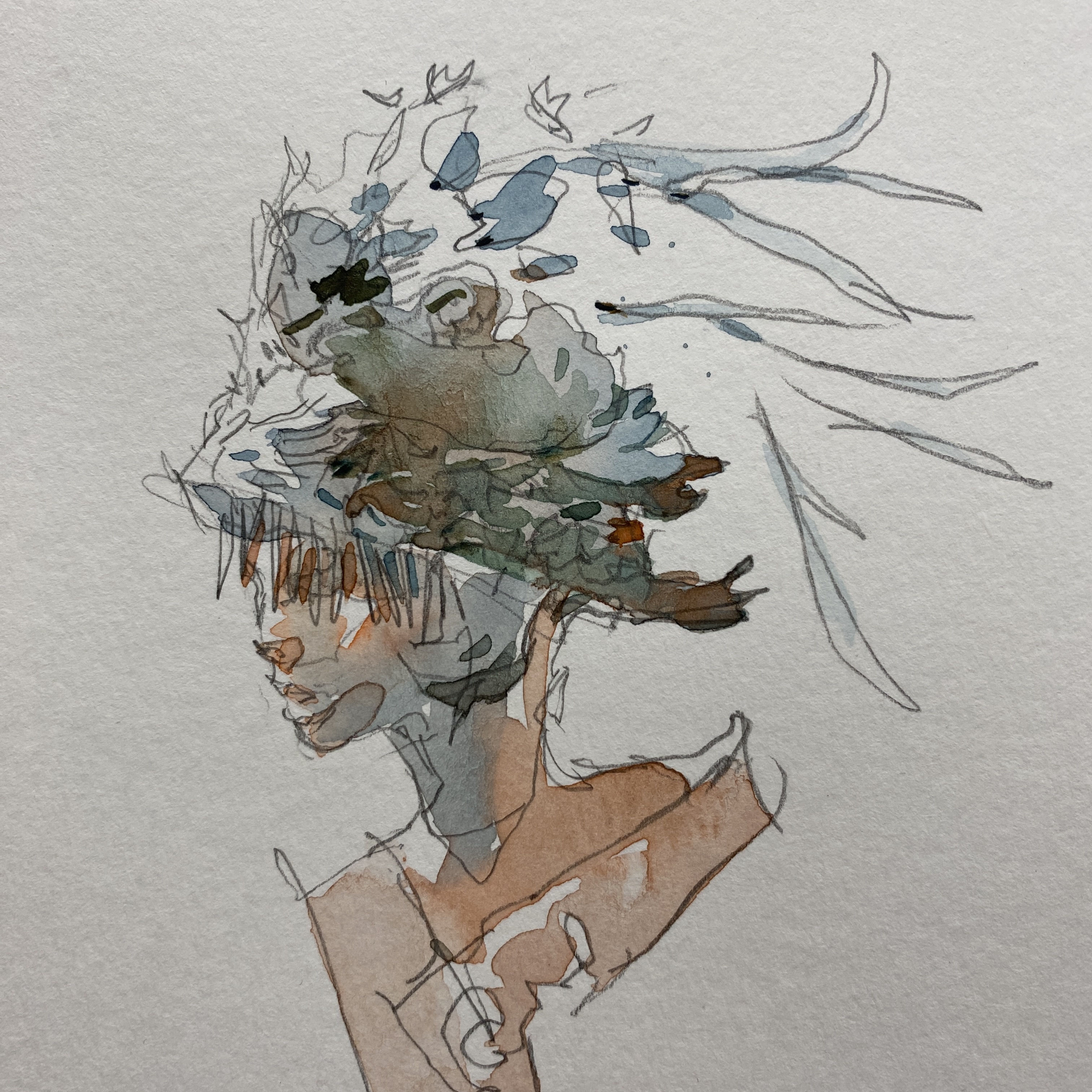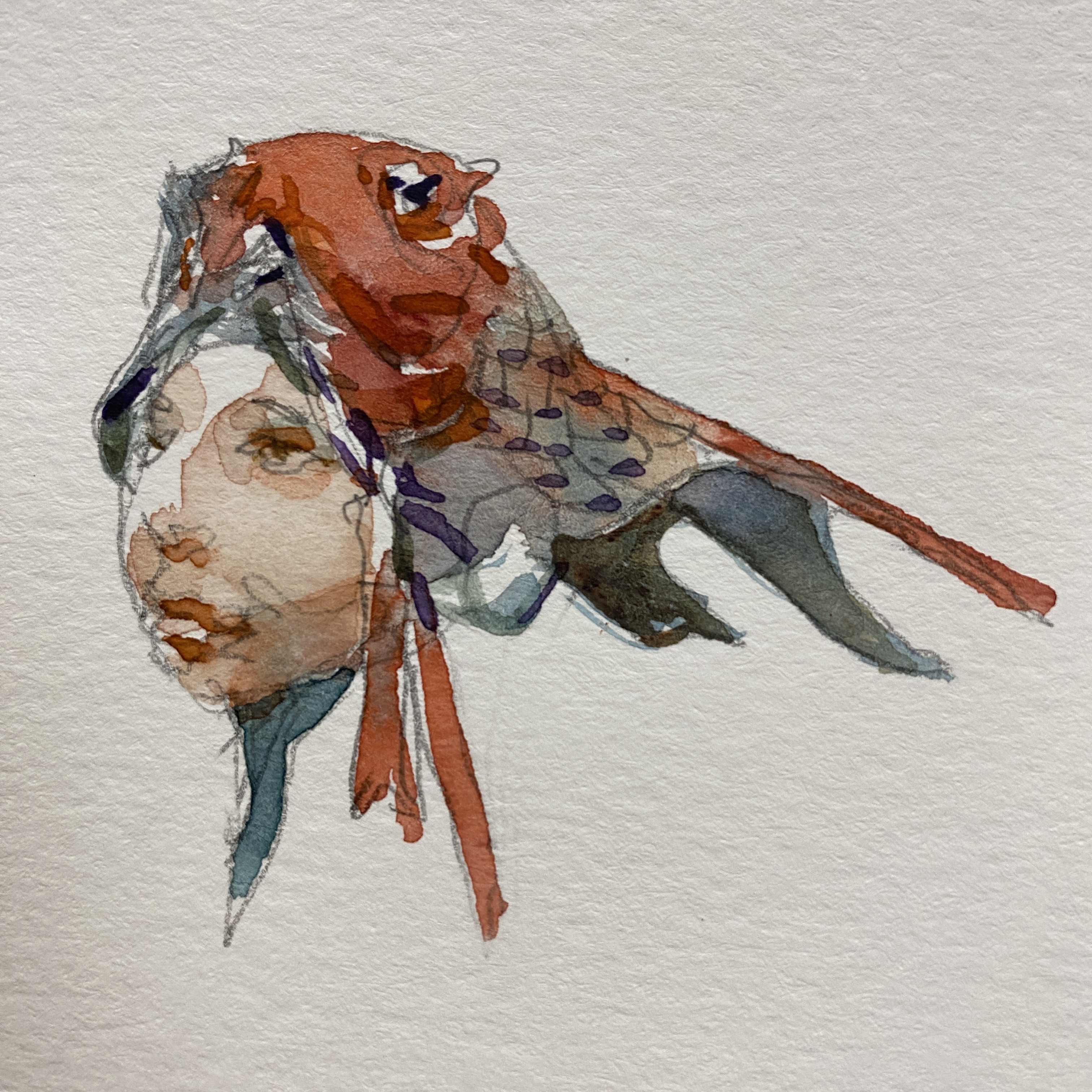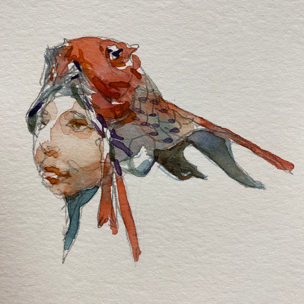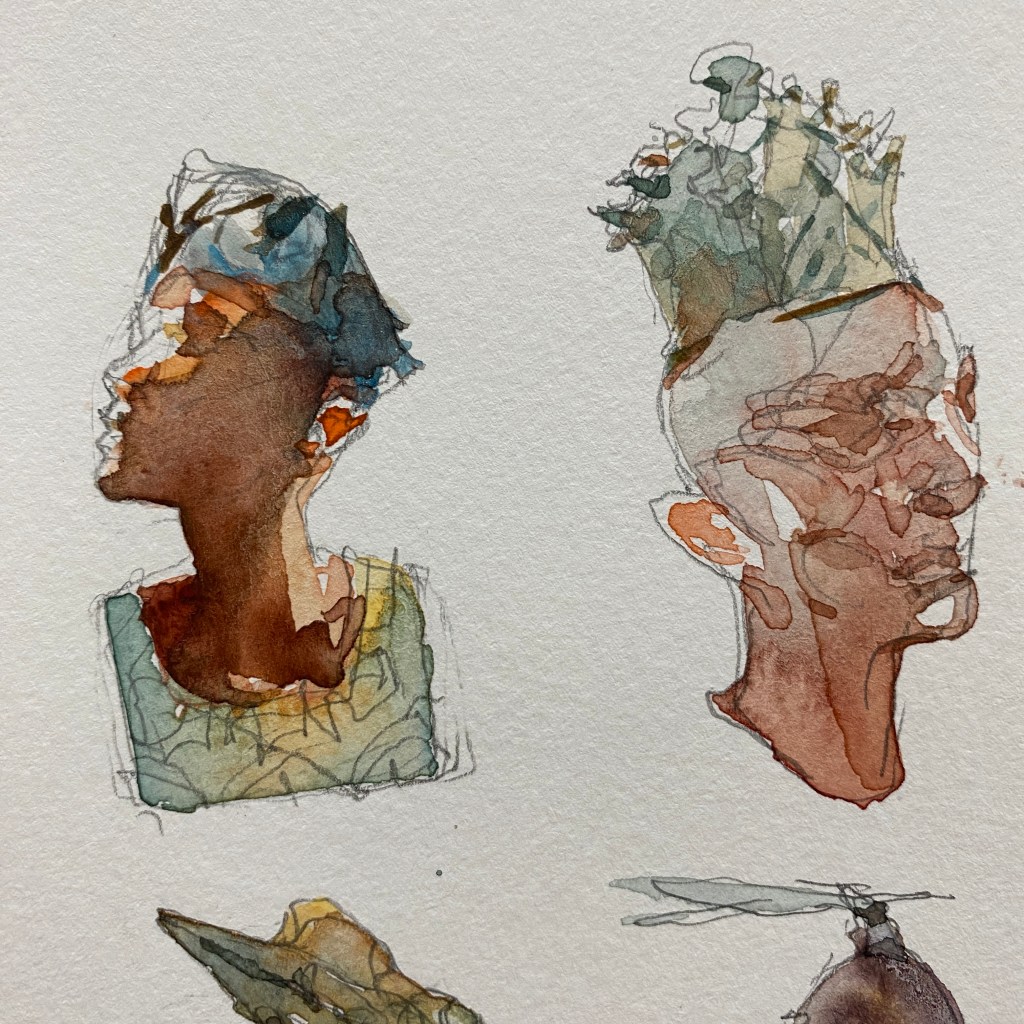 I made a first pass that’s completely wet and wild, using 2″ flat to flow color onto these 6×9″ pages. Then came back with selective wet-on-dry blends, pushing and pulling edges, seeing if I can bring the figure back into focus.