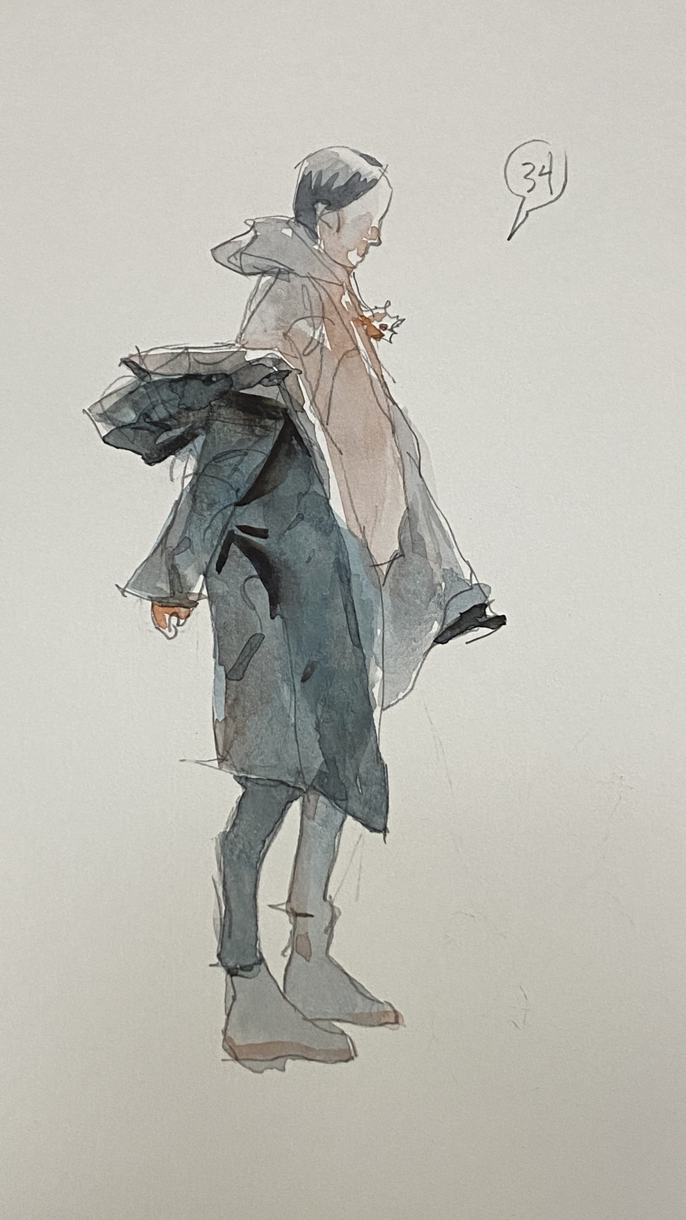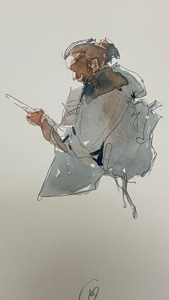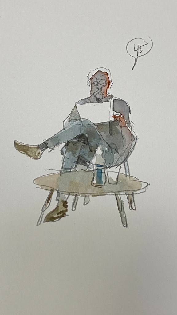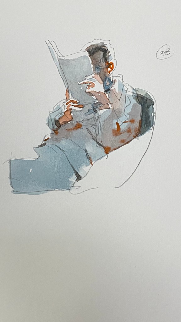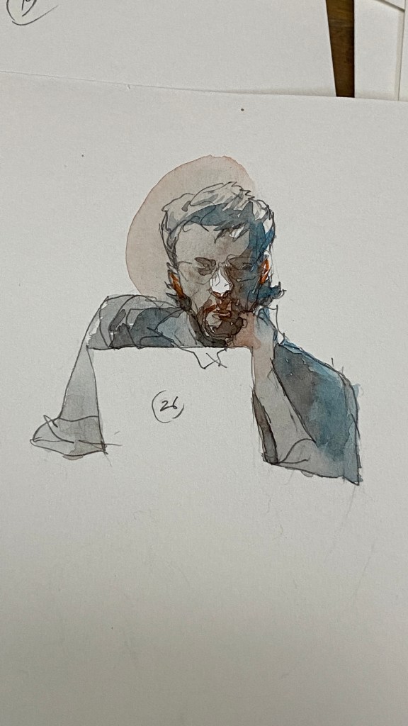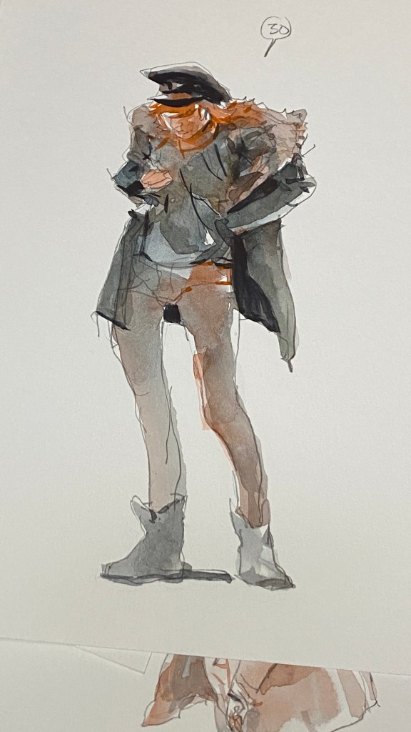 So yes – I ended up taking over a table in the study area, and working on big batches of drawings. I could lay out 10 or 15 wet washes, and by the time those were done I could start rotating back for the next layer. It helps that it’s very dry here during winter months. And, I could take breaks whenever I wanted, walking around getting some more poses.