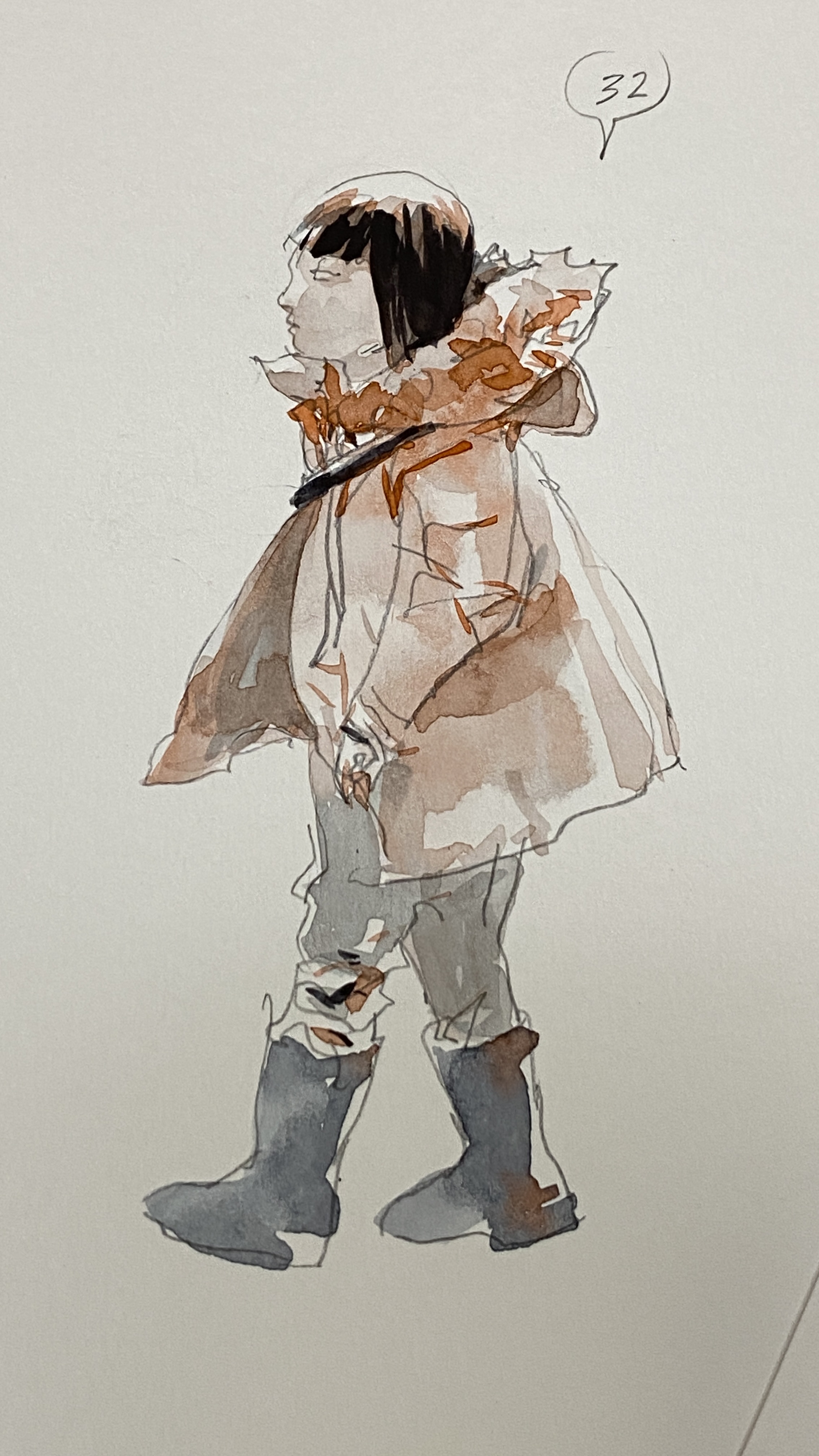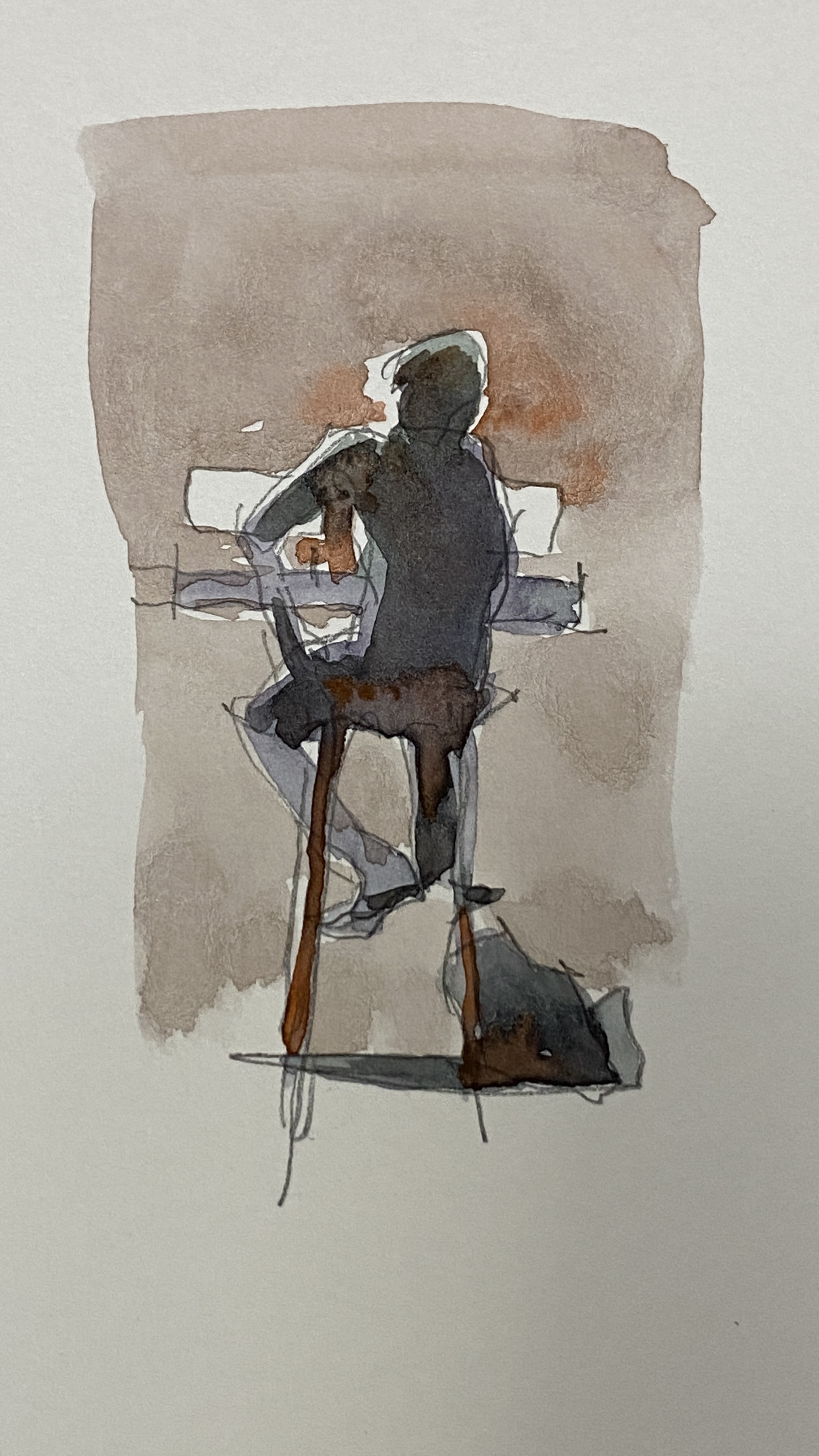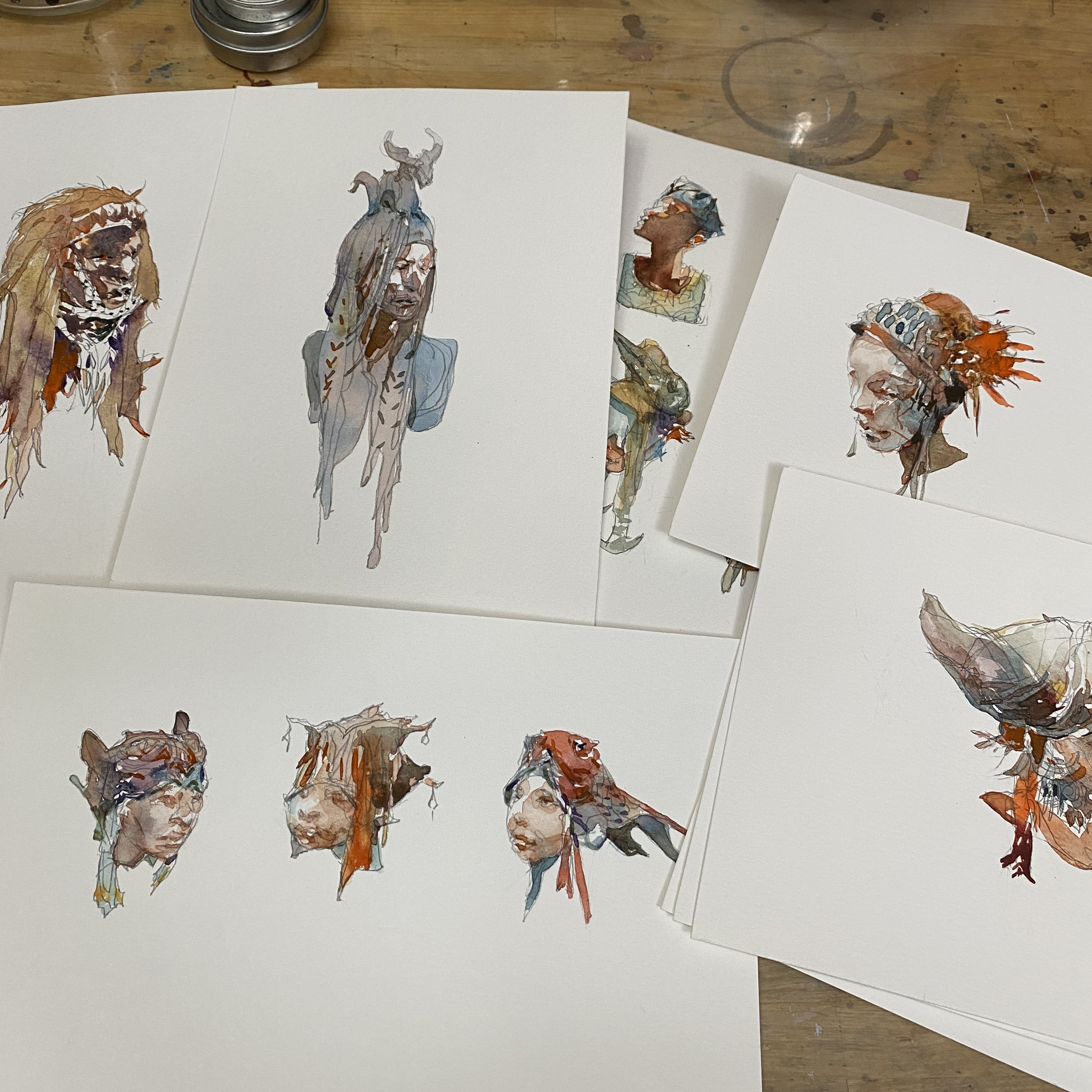 So yes – I ended up taking over a table in the study area, and working on big batches of drawings. I could lay out 10 or 15 wet washes, and by the time those were done I could start rotating back for the next layer. It helps that it’s very dry here during winter months. And, I could take breaks whenever I wanted, walking around getting some more poses.