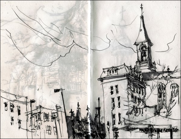 Through the thin paper of this cheap sketchbook, you can see a more pointed bell-tower sketched on the back page.