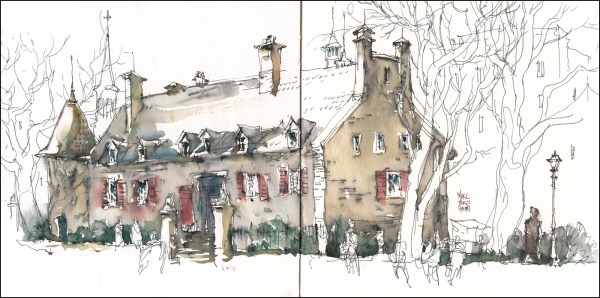Here’s my 2014 sketch of the house. Back then I was using pen and ink and wash, and I was much more concerned about getting the entire building into the frame. Even though, I was writing at the time about designing a good picture, not just making a snapshot. It’s fun to see, 3 years later, how much I’ve taken my own advice.
