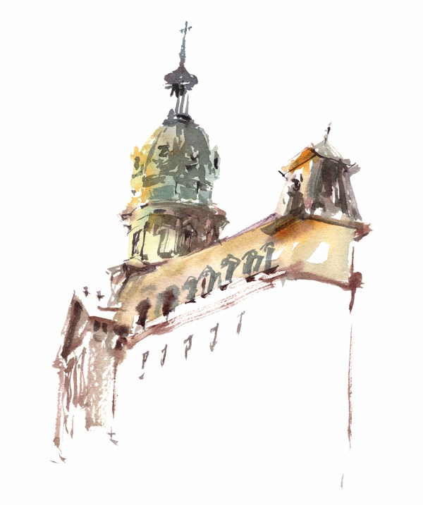 In the rooftops here, I washed the flat shape first with gold to give it a sun-downing look. then came back with the darks. So there’s no reserved white in the dome, but that works because it’s edging towards being back-lit about now.