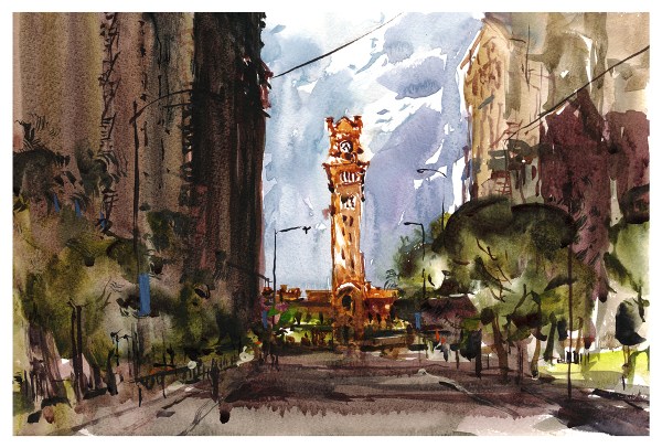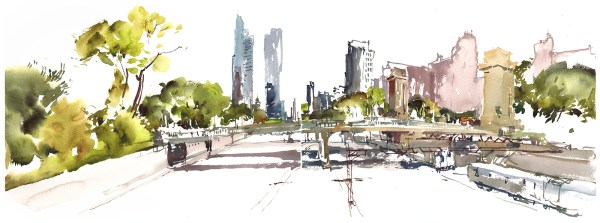 Especially if you decide you don’t care about architectural rendering, and you’re just going to make a lively sketch. You can still feel the presence of the city, even if you reduce those huge buildings with hundreds of windows into flat shapes.