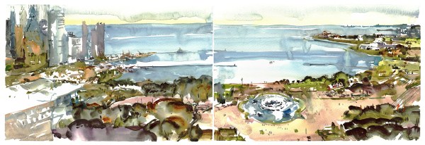 Standing back on this same spot, five years later – I’m not sure if I remembered these two overlapping drawings, or if it’s simply a matter that these are the only interesting things to draw at this spot. Either way, my new sketch (at top) literally combines the two towers into one composite drawing.