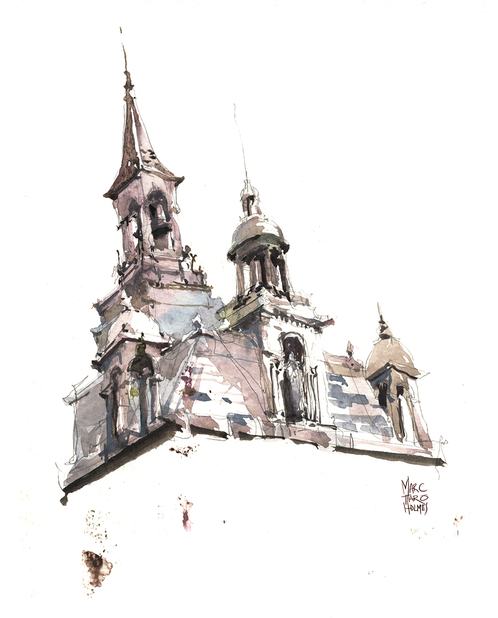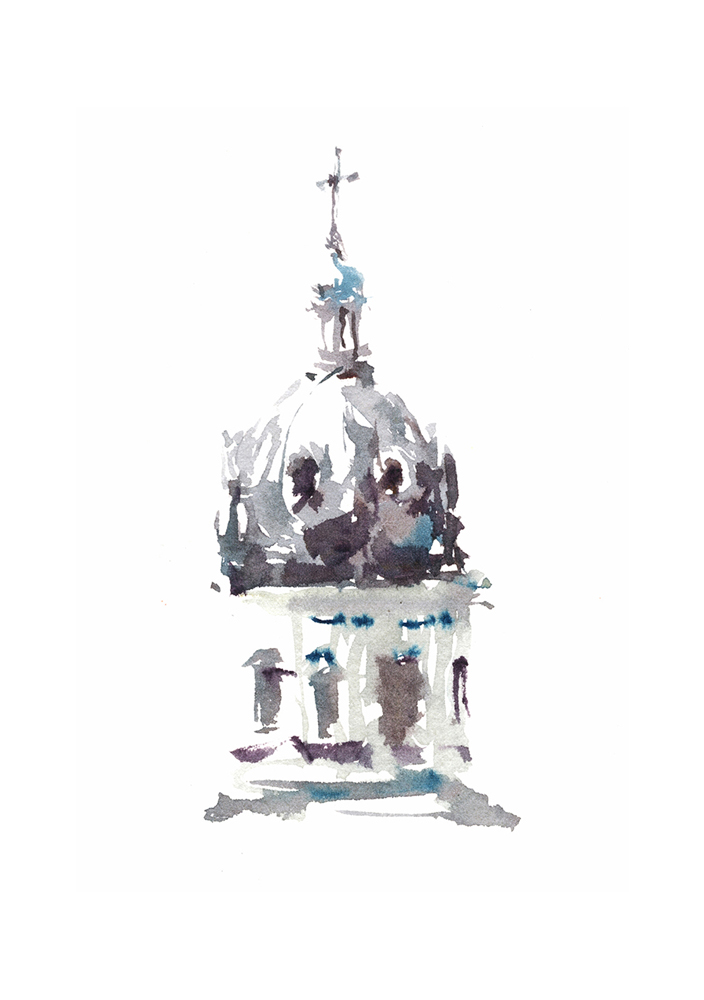In the rooftops here, I washed the flat shape first with gold to give it a sun-downing look. then came back with the darks. So there’s no reserved white in the dome, but that works because it’s edging towards being back-lit about now.