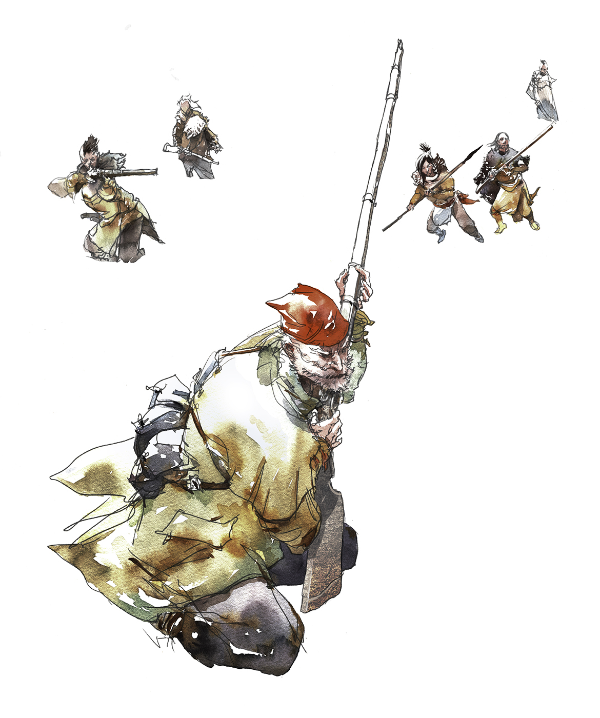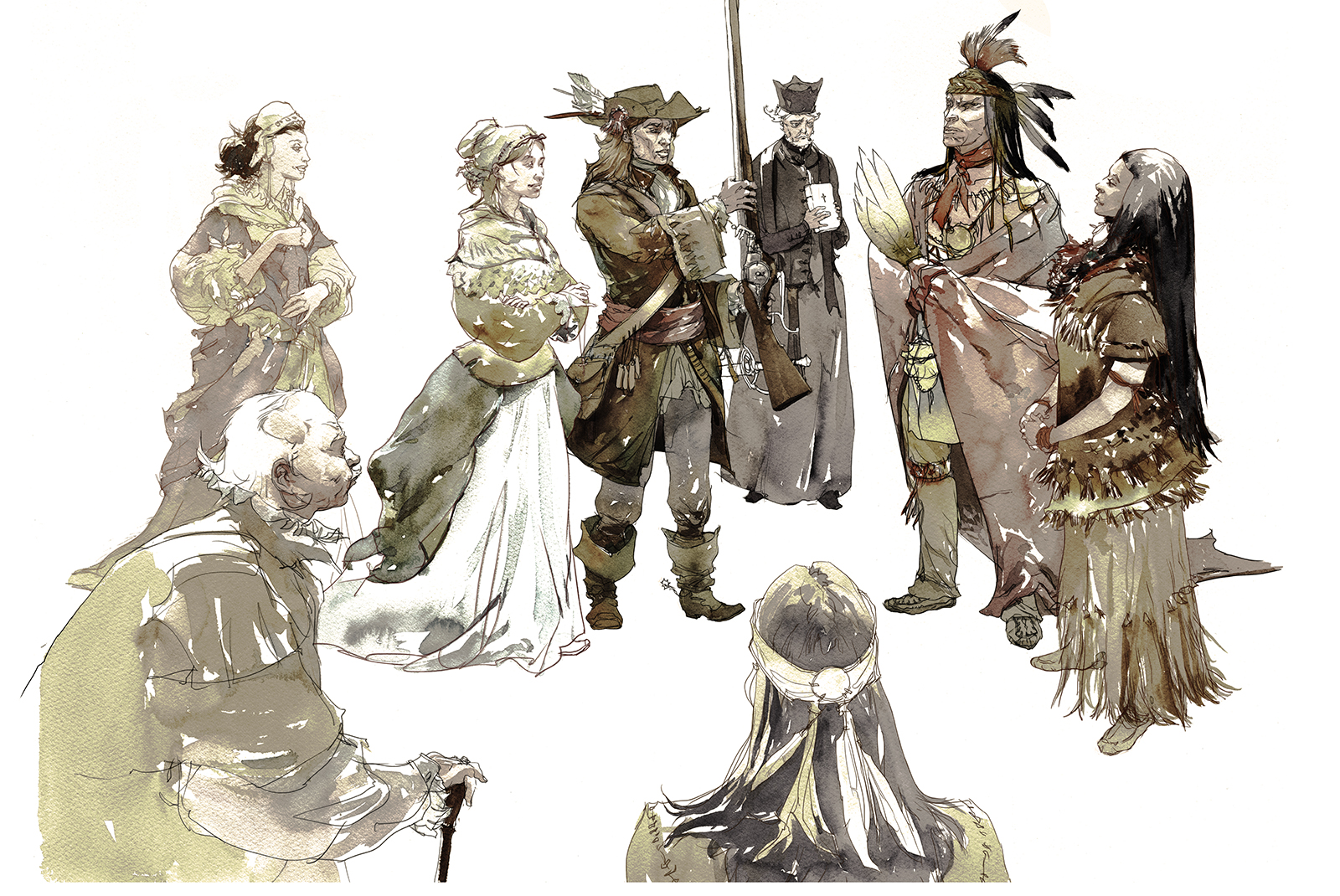 This time, I was tasked to visualize some of the people involved in our first footfall on the island. I did paint some backgrounds for these, but I prefer the characters without.