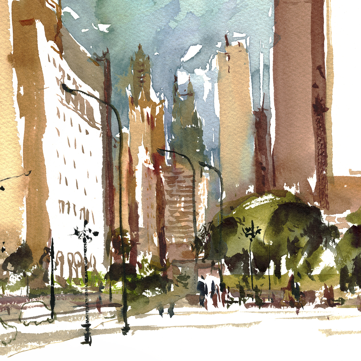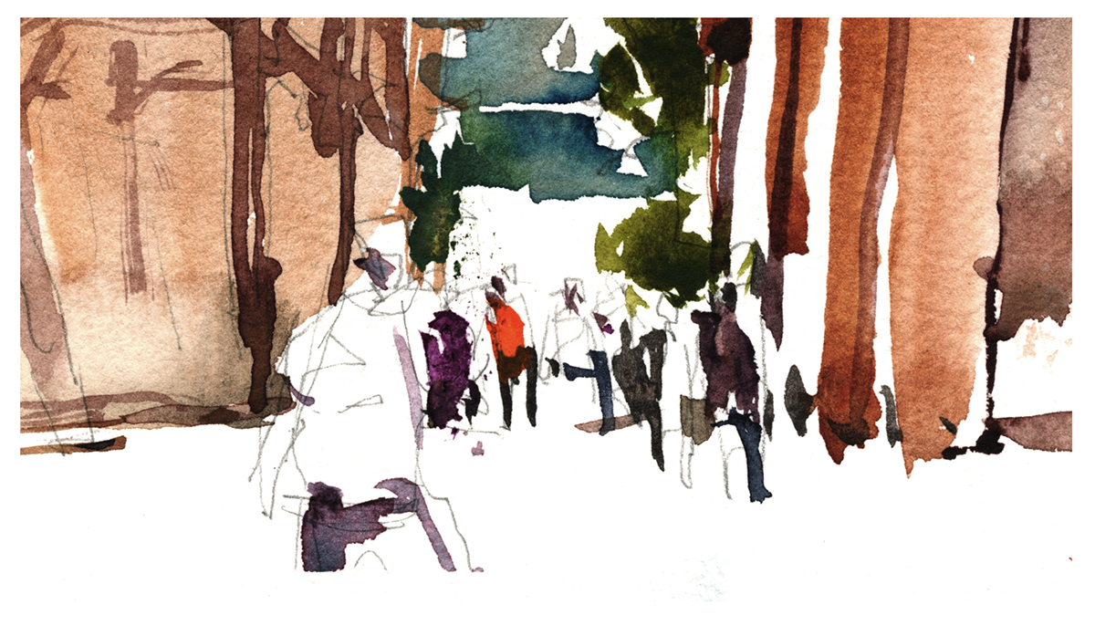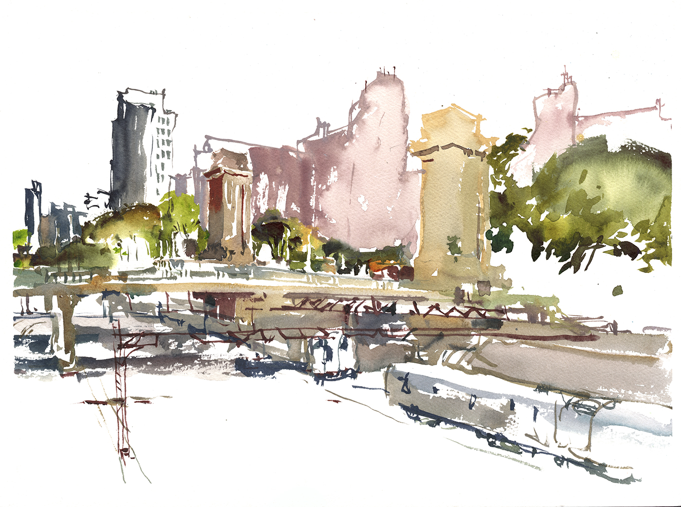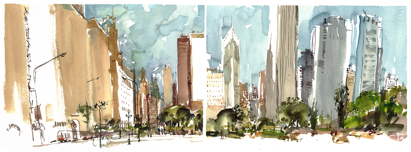 Especially if you decide you don’t care about architectural rendering, and you’re just going to make a lively sketch. You can still feel the presence of the city, even if you reduce those huge buildings with hundreds of windows into flat shapes.