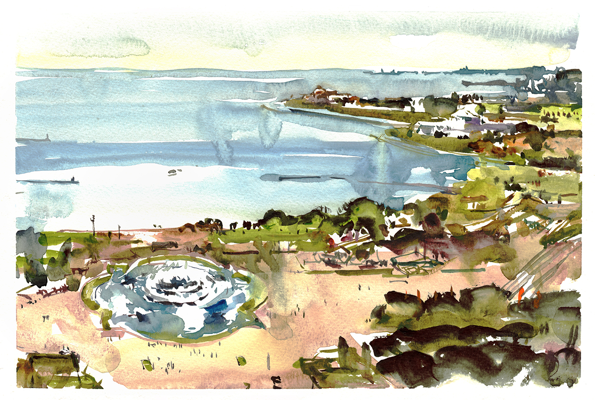 Standing back on this same spot, five years later – I’m not sure if I remembered these two overlapping drawings, or if it’s simply a matter that these are the only interesting things to draw at this spot. Either way, my new sketch (at top) literally combines the two towers into one composite drawing.