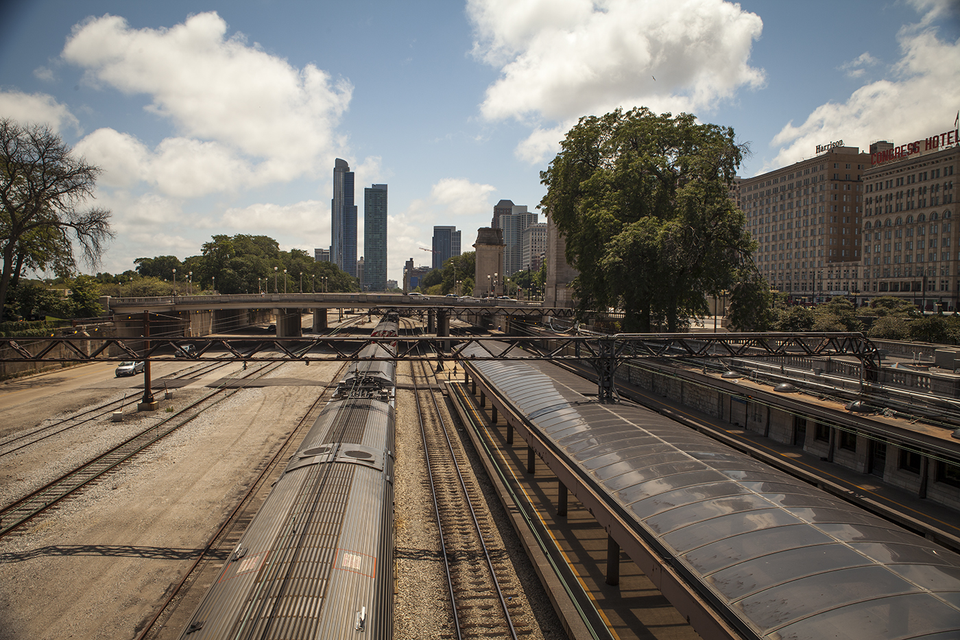 Looking north we had the Magnificent Mile in the distance, looking south (my favorite) the park surrounding the Field Museum and some glass towers rising above the train yards.