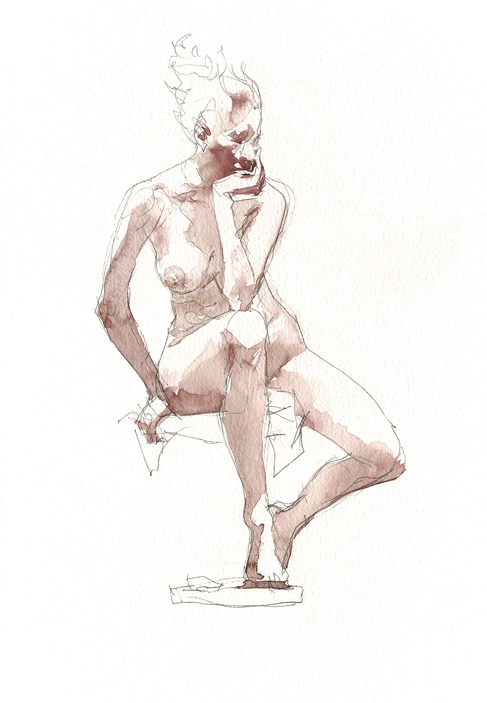The alignment of weight bearing points on chin, elbow, and foot? and the repeating shapes of bent arm and knee? All that with a mood of melancholy – you are looking at one great model there.